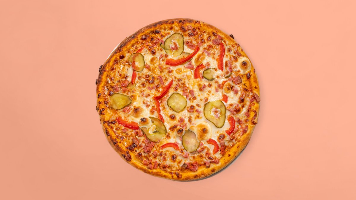 доматен сос, шунка, моцарела сирене, чушки, кисели краставици 450г