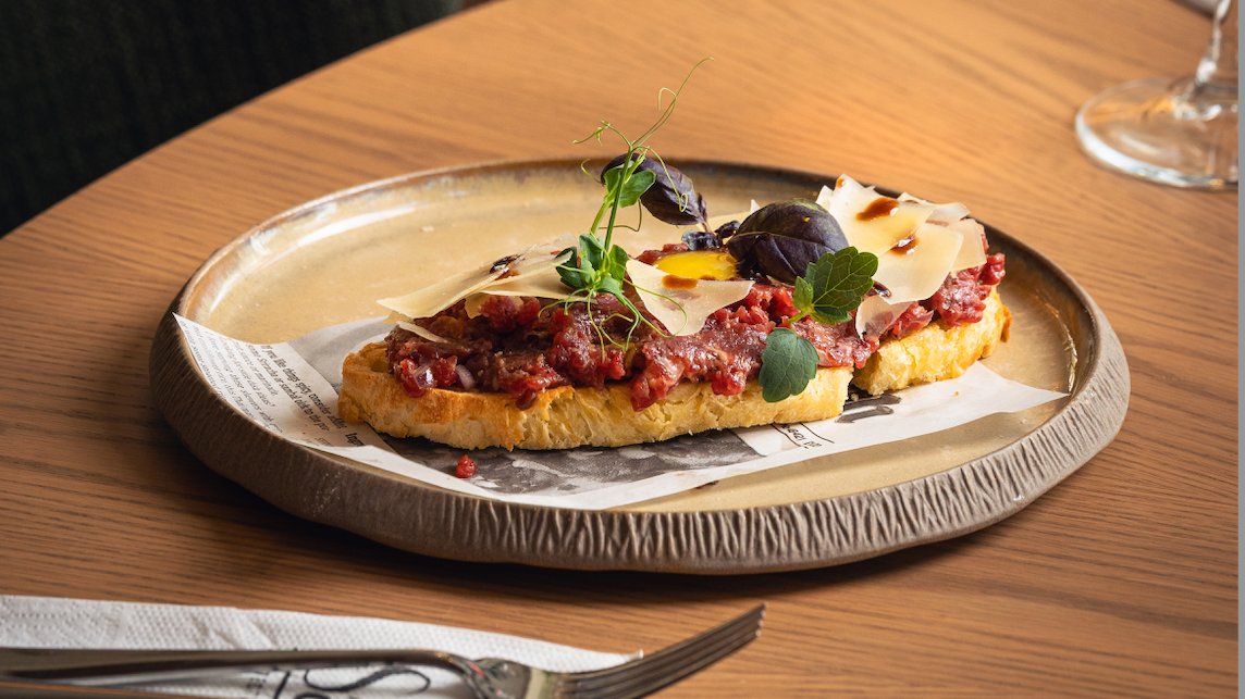 телешко месо, горчица, червен лук, зехтин, сос Уорчестър, пъдпъдъче яйце, пармезан, хляб - 150 гр.