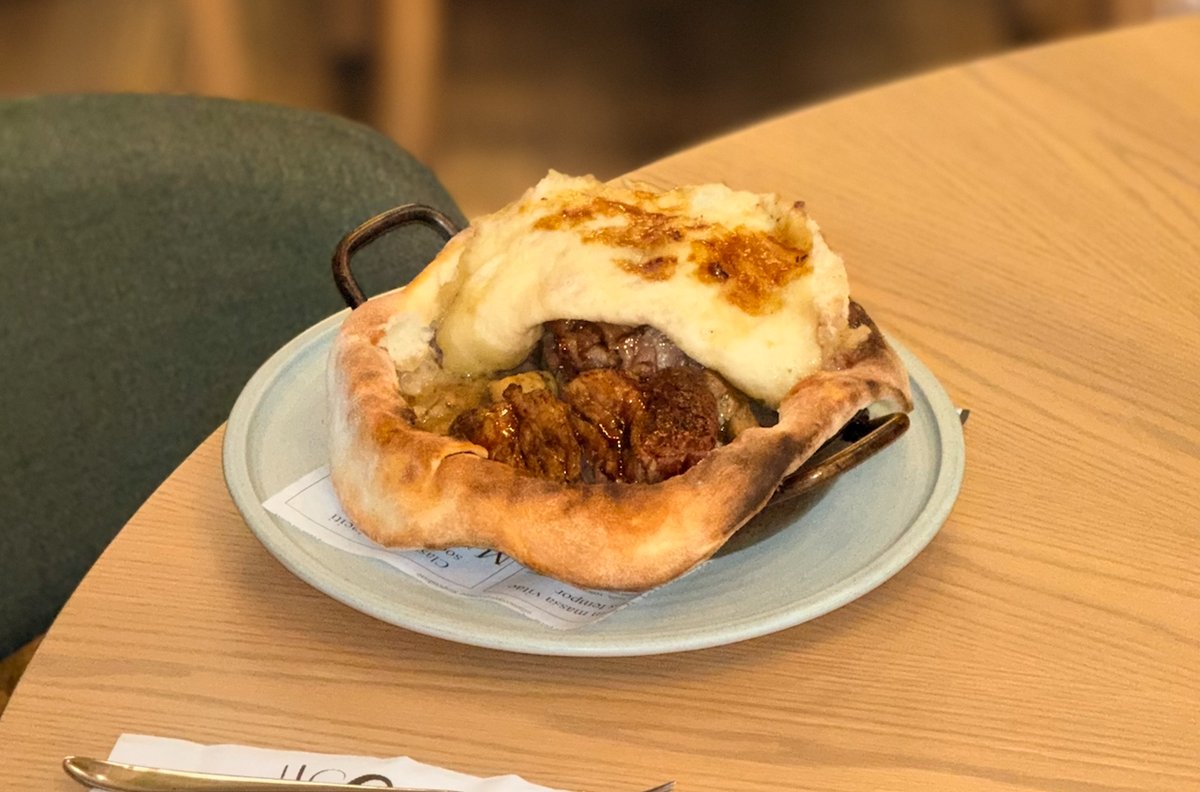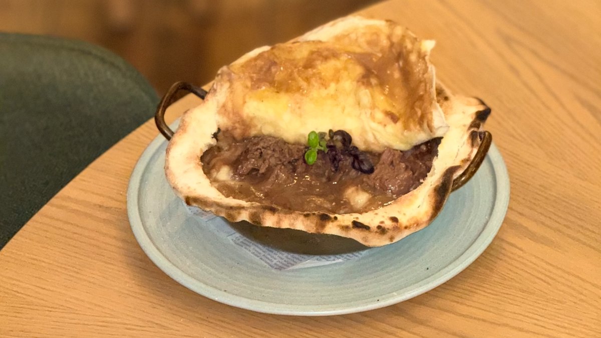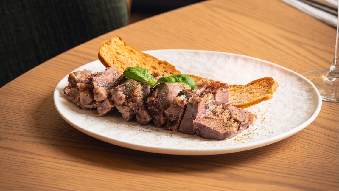 Нашата домашна телешка саздърма, сервирана с брускета с олио и червен пипер