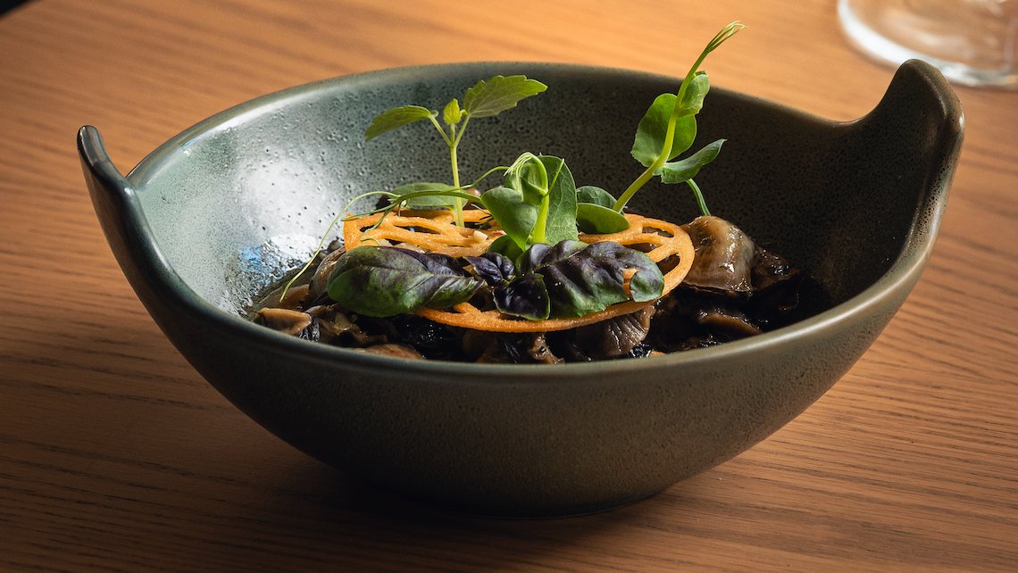 Гъби кладница с поширано яйце, качамак и билки