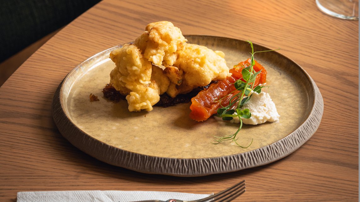 Карфиол "Темпура" с рачел от тиква,тиро сос и крем шалот