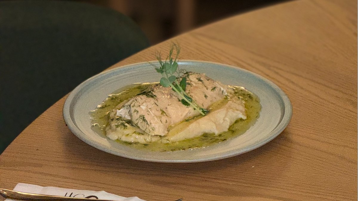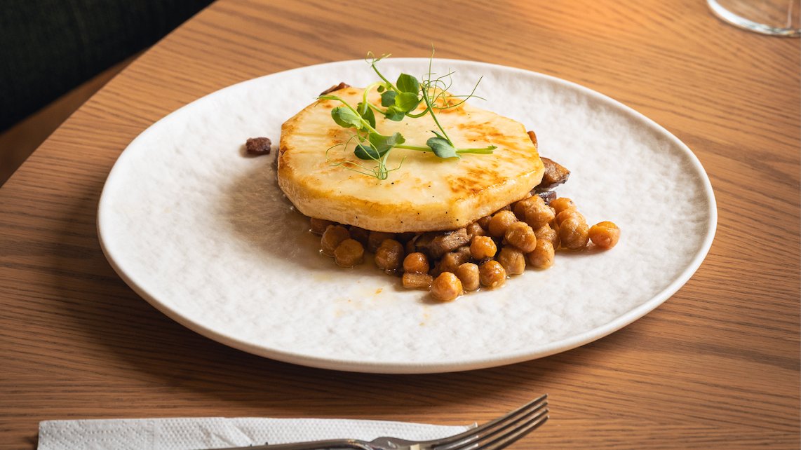 Телешки бузи с крем "Шалот" и трюфел аромат, върху пюре от целина