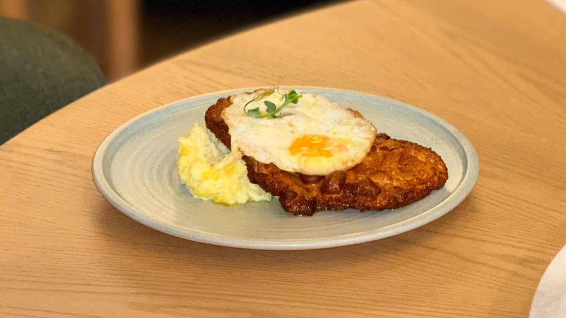Свински шницел "Гранде", върху картофи с чесън и яйце