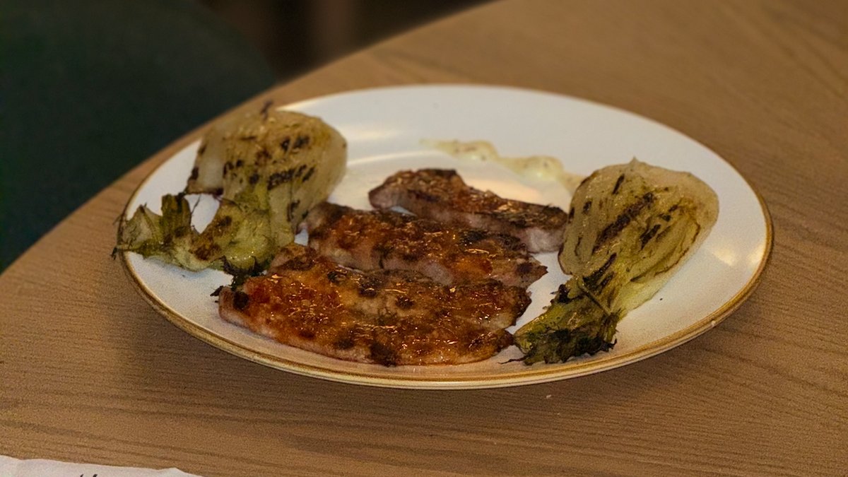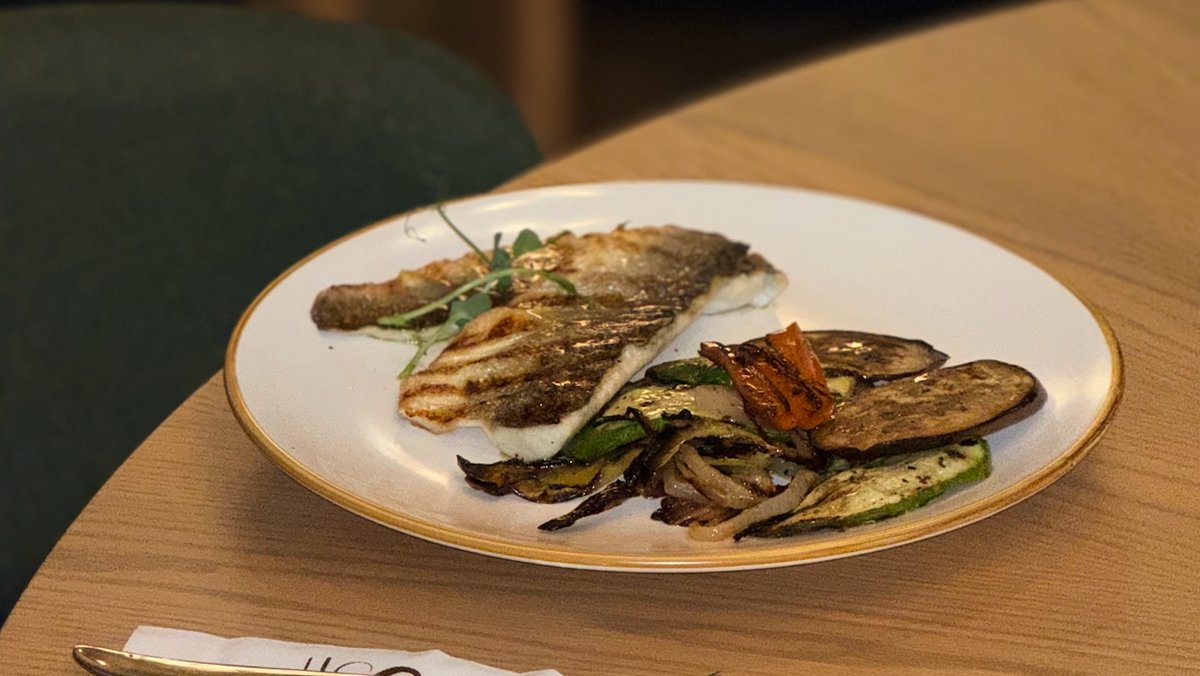 Филенца лаврак на барбекю с печени зеленчуци