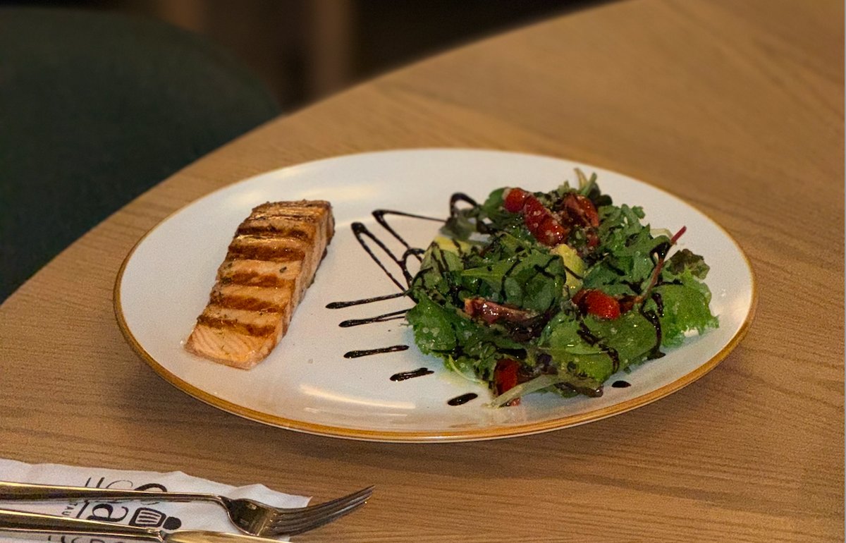 Сьомга филе, гарнирано с микс зелени салатки, авокадо и киноа