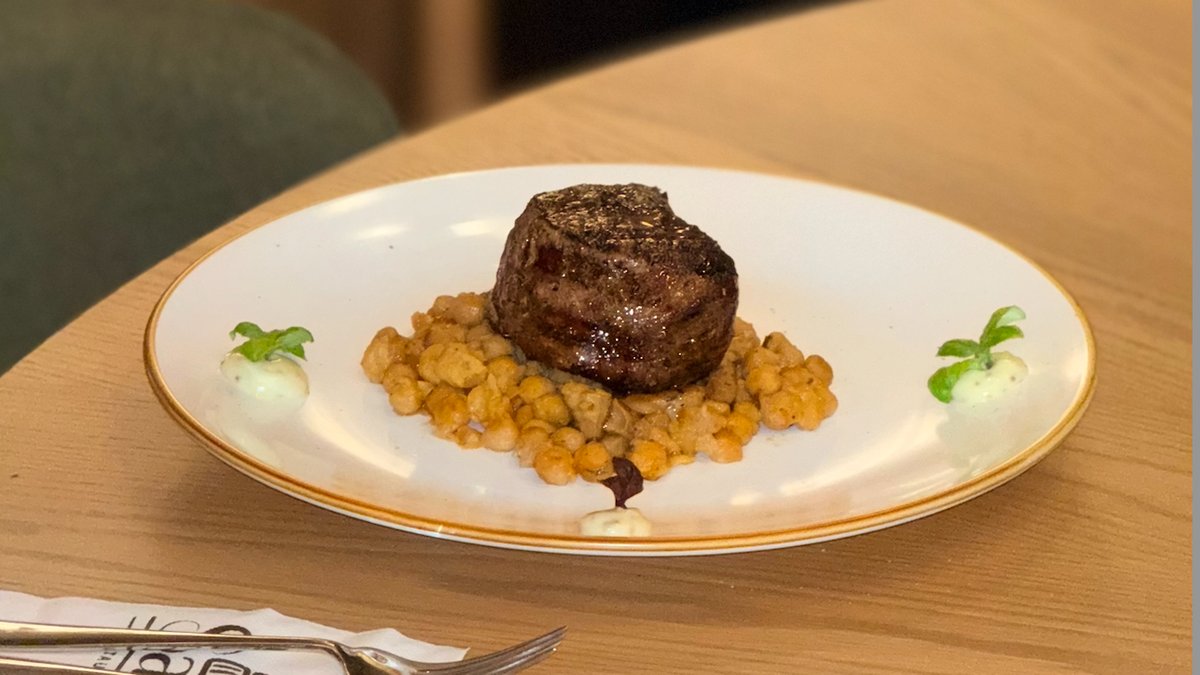 Стек от целина, върху нахут с гъби