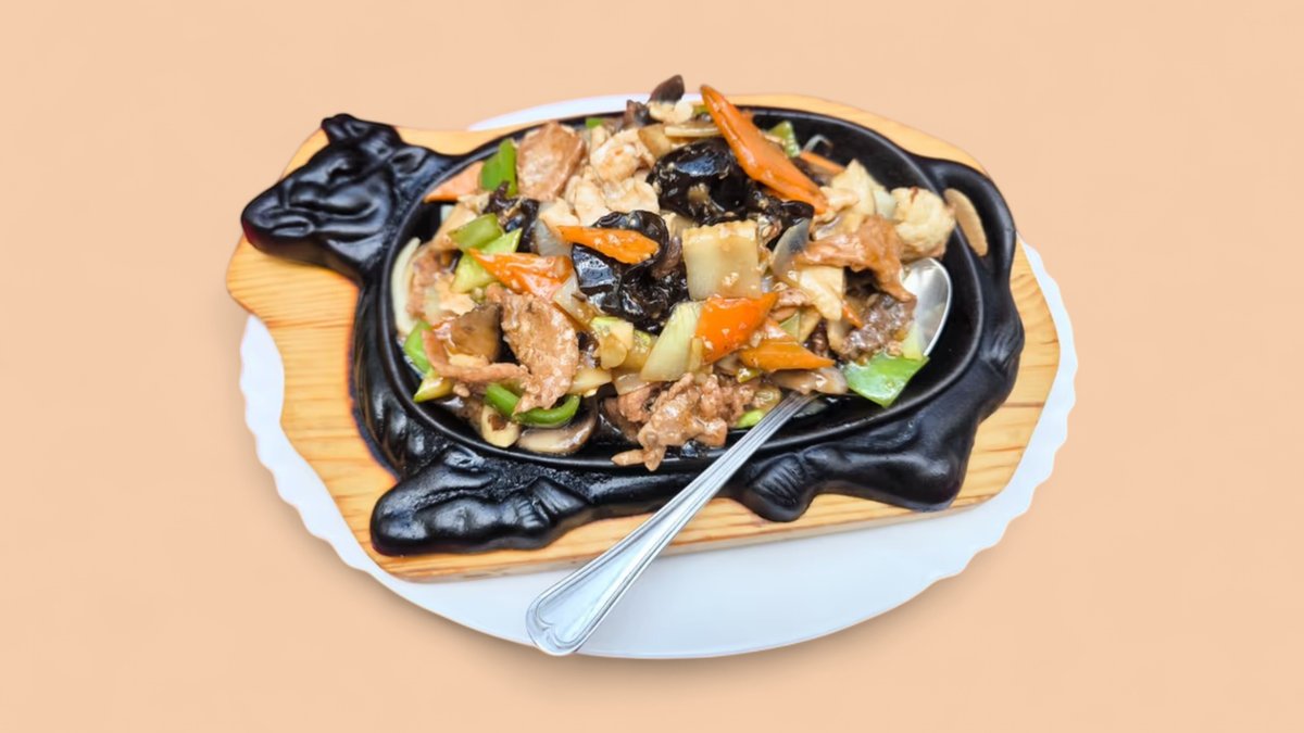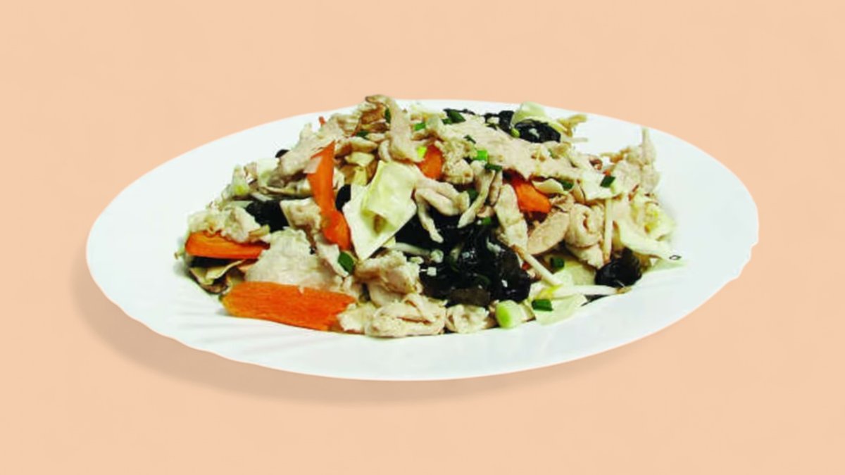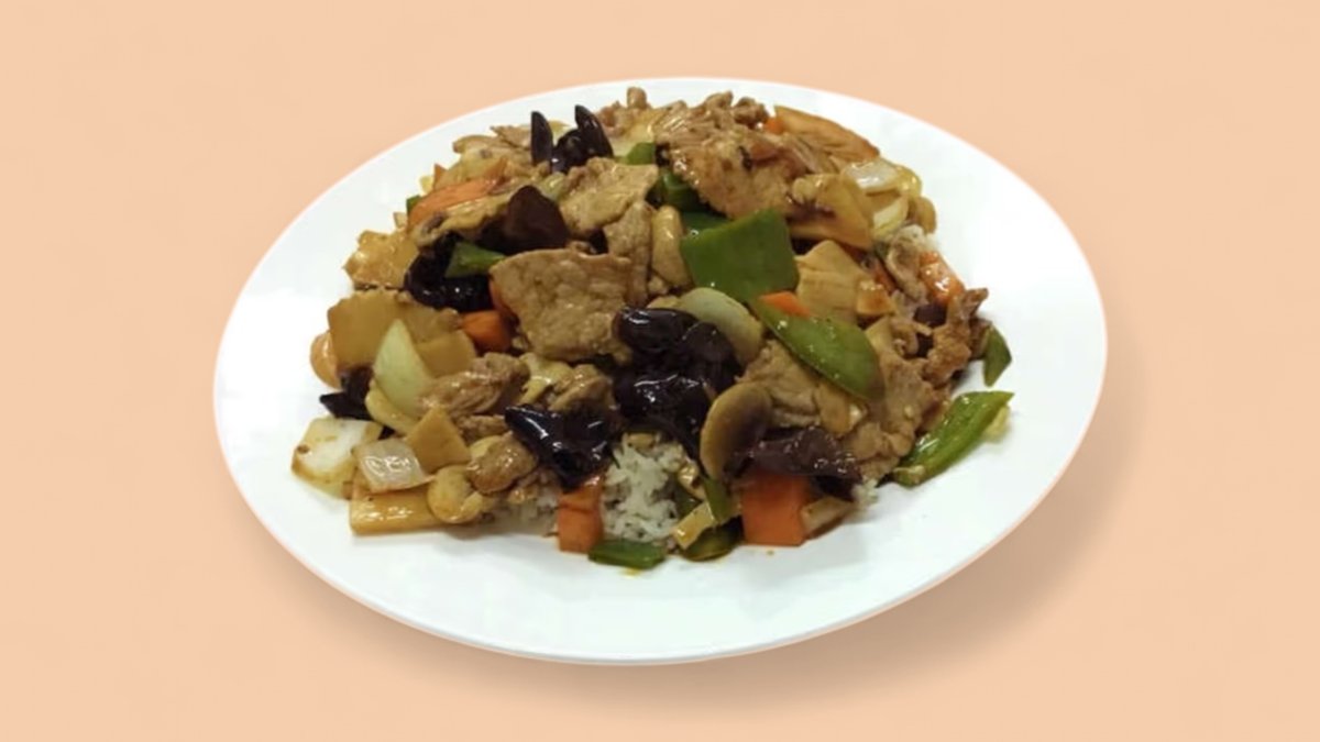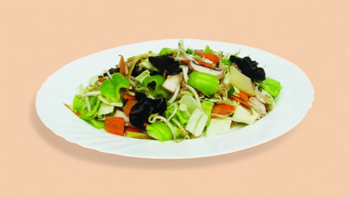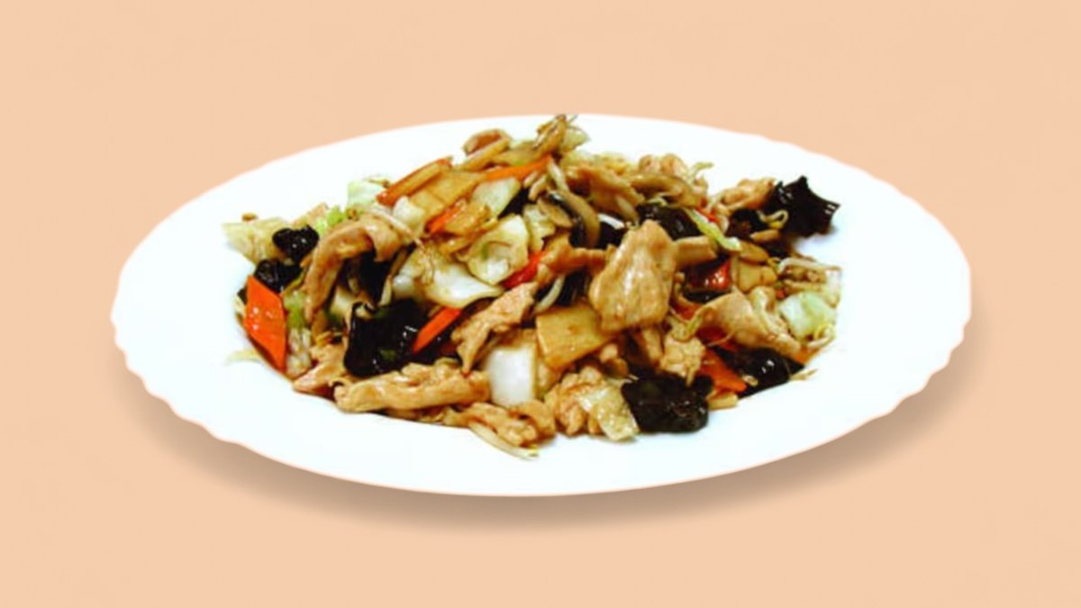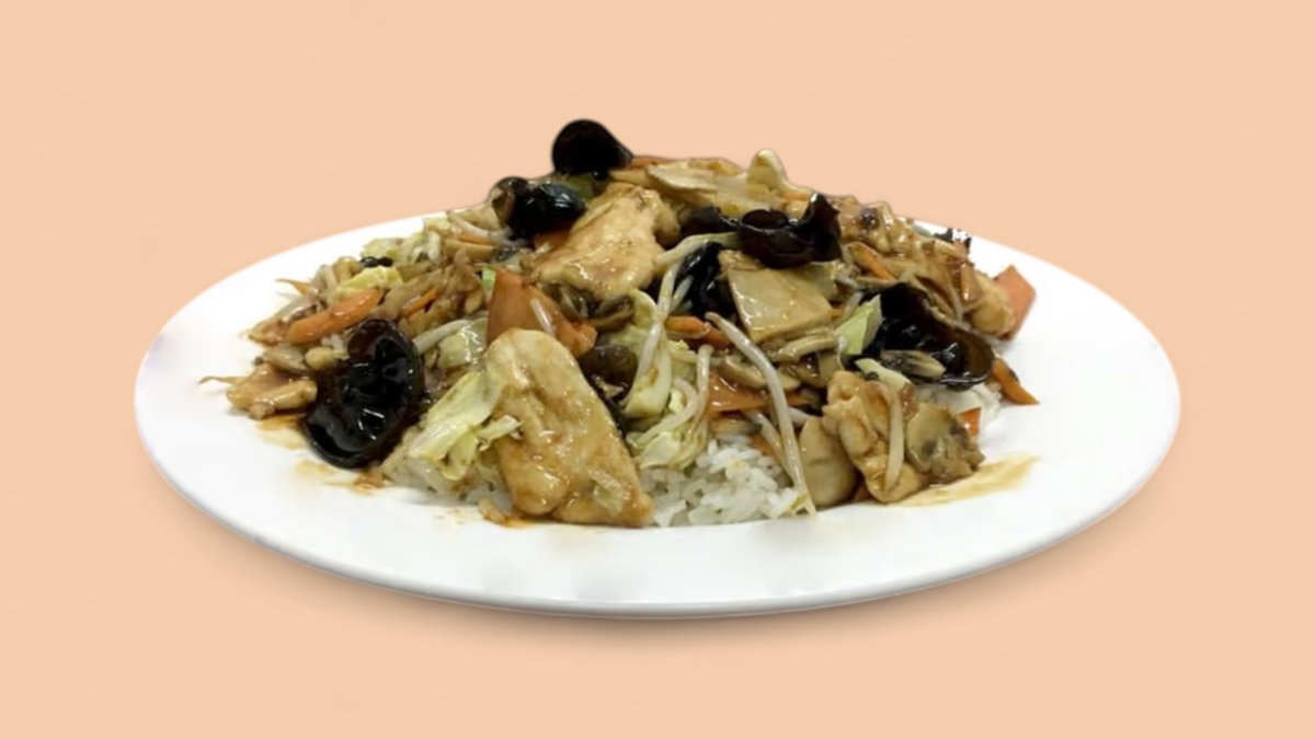 пилешко месо, зеле, печурки, моркови, бамбук, соеви кълнове, китайски гъби, бял ориз 600г