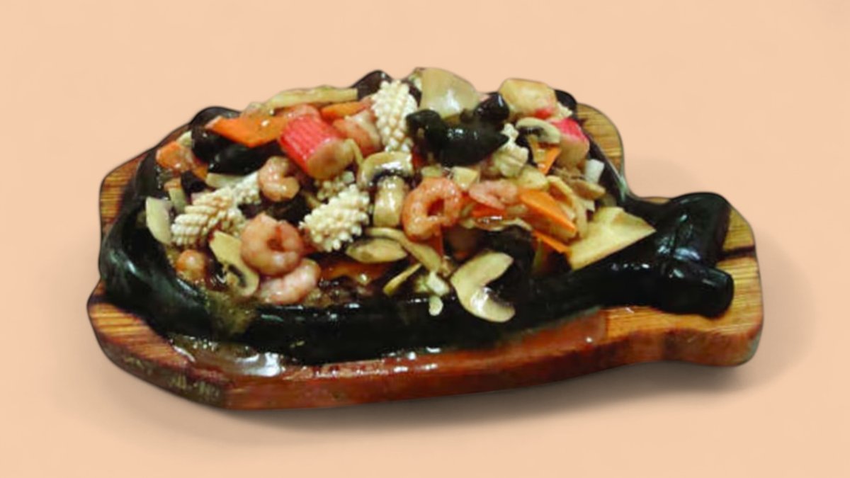 41А. Морски деликатеси с ориз къкрещи върху метална плоча