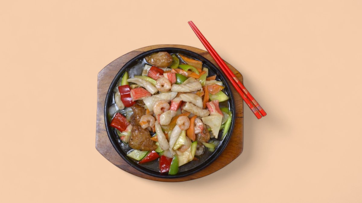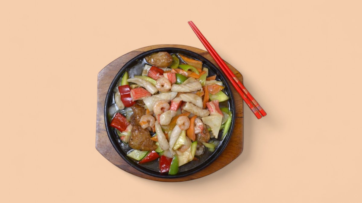 42. Морски деликатеси с оризово фиде къкрещи върху метална плоча Раци, скариди, калмари, оризово фиде зеле, моркови, лук,