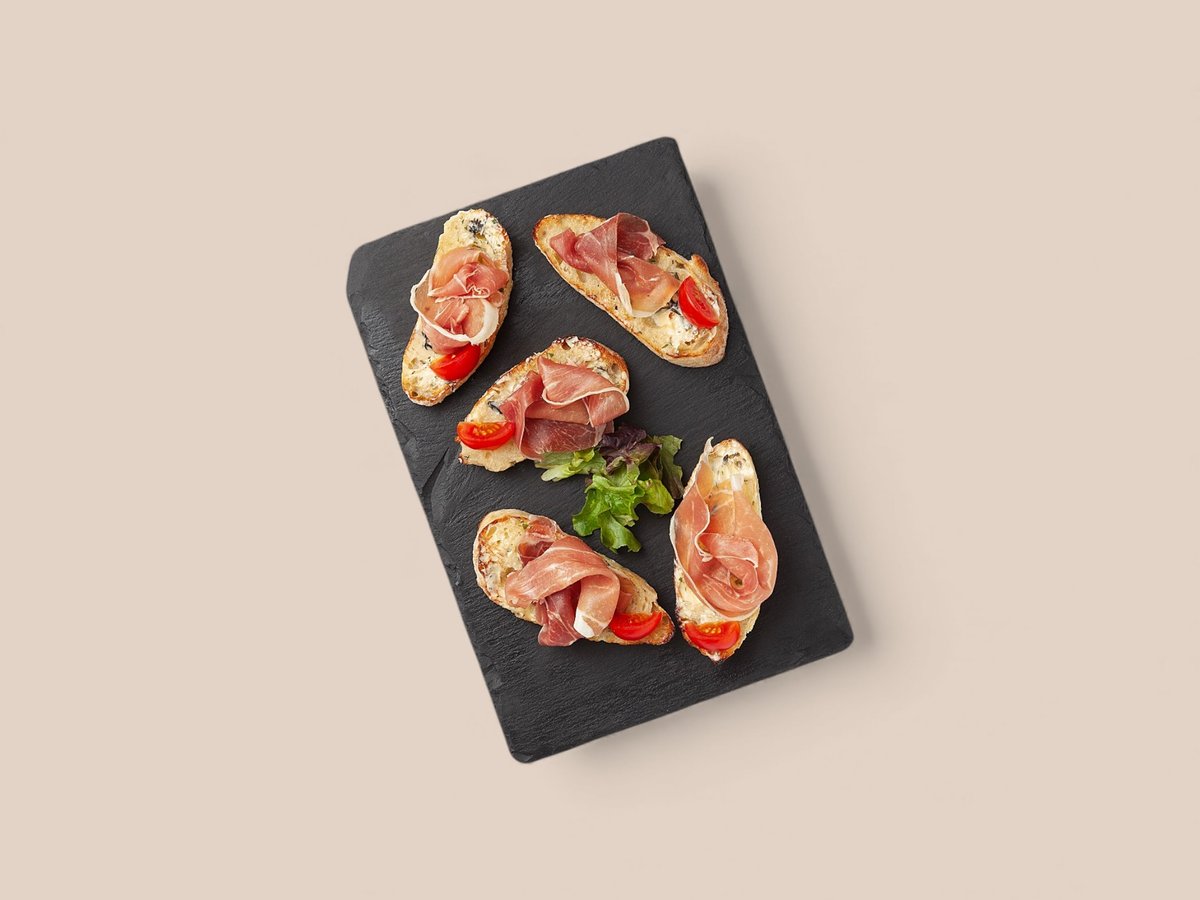 домашно изпечена чабата. Прошуто крудо, чери домати, билково масло 180г