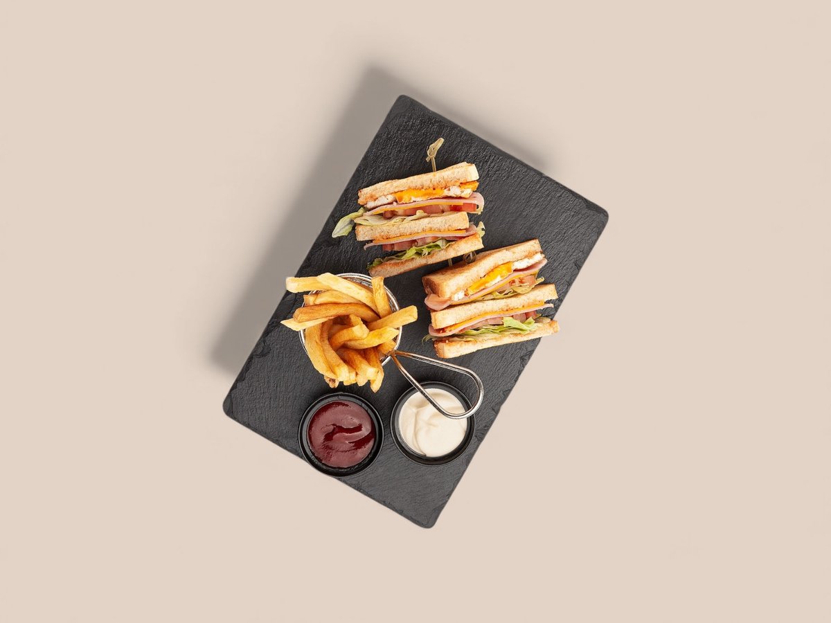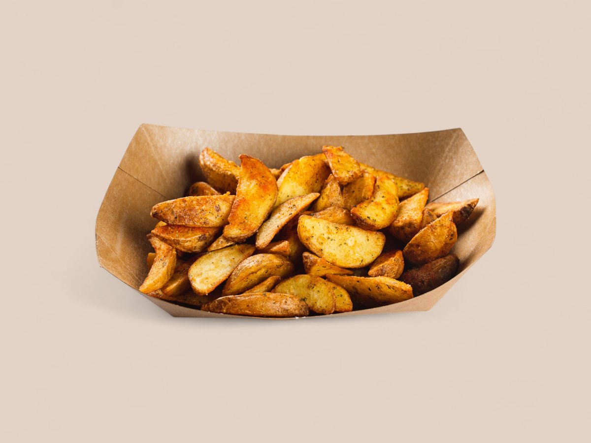 хрупкави пилешки филенда, сирене моца-рела, сирене чедър, салатен микс, домат, чушки, млечно-чеснов сос, пържени картофи, сос кетчул 300г