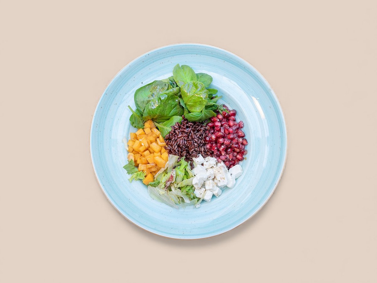 патладжан, тиквички, гъби, киноа, сирене моцарела, маслини микс, доматен сос пресен магданоз 300г