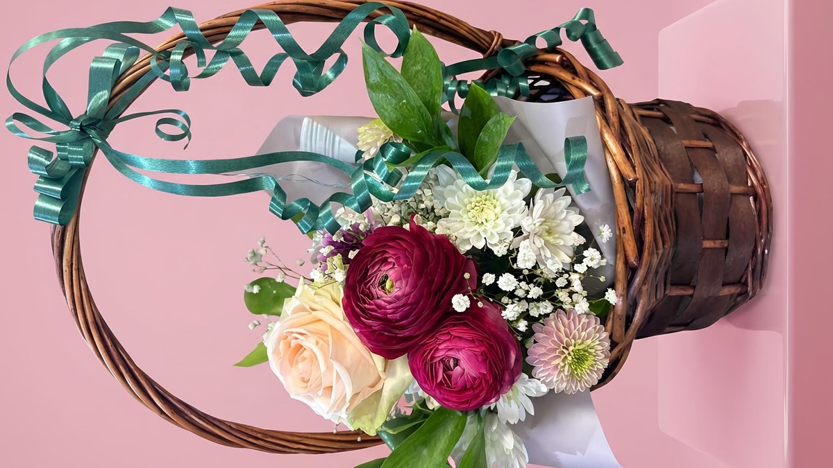 Аранжировка с цветя и вино в кошница