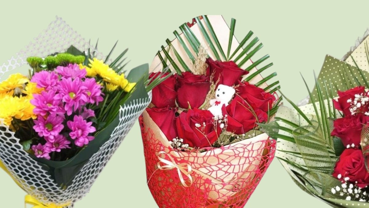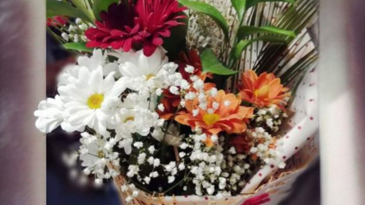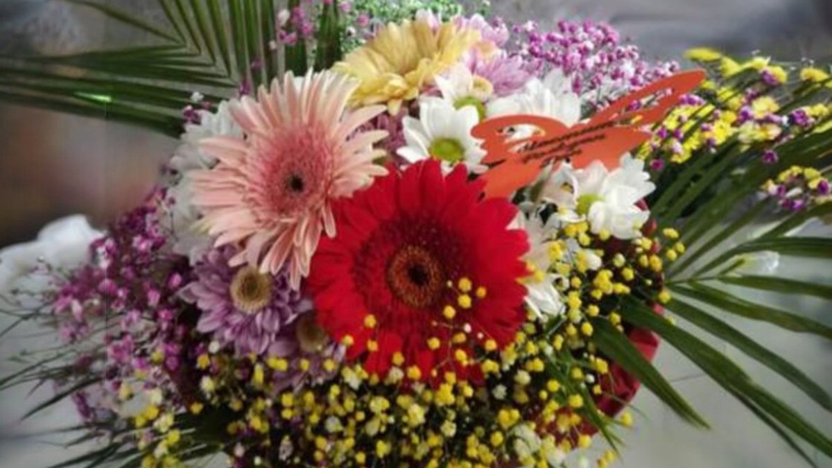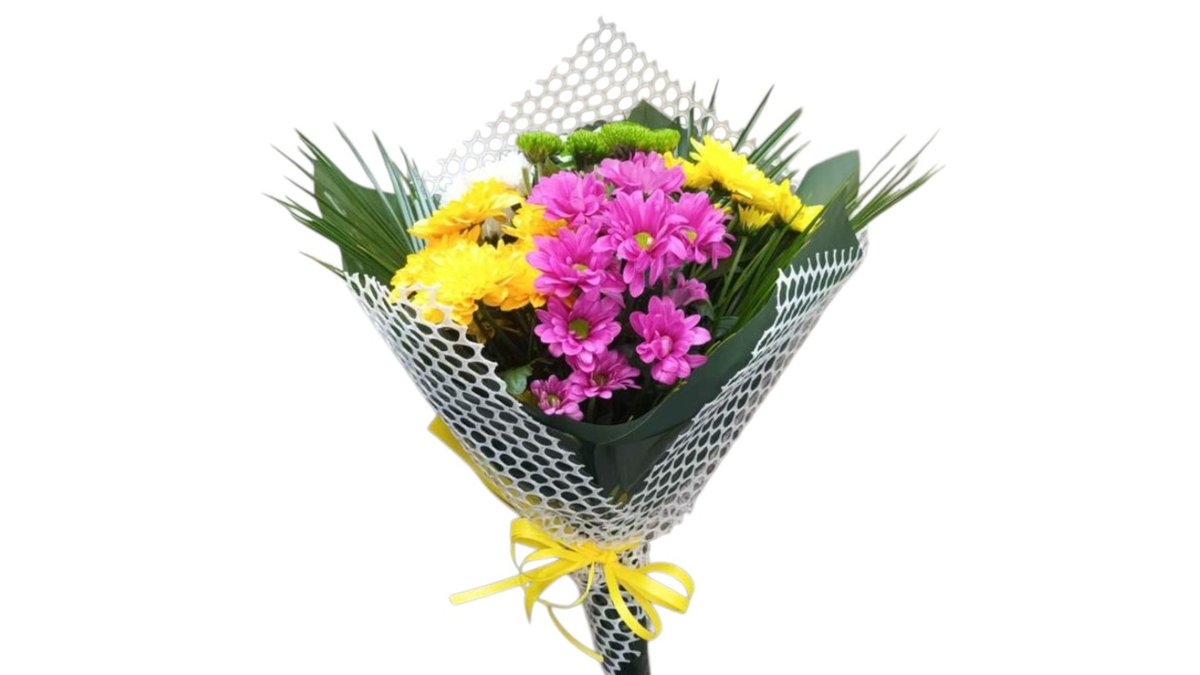 3 гербера, 2 хризантеми с богата зеленина и луксозна опаковка