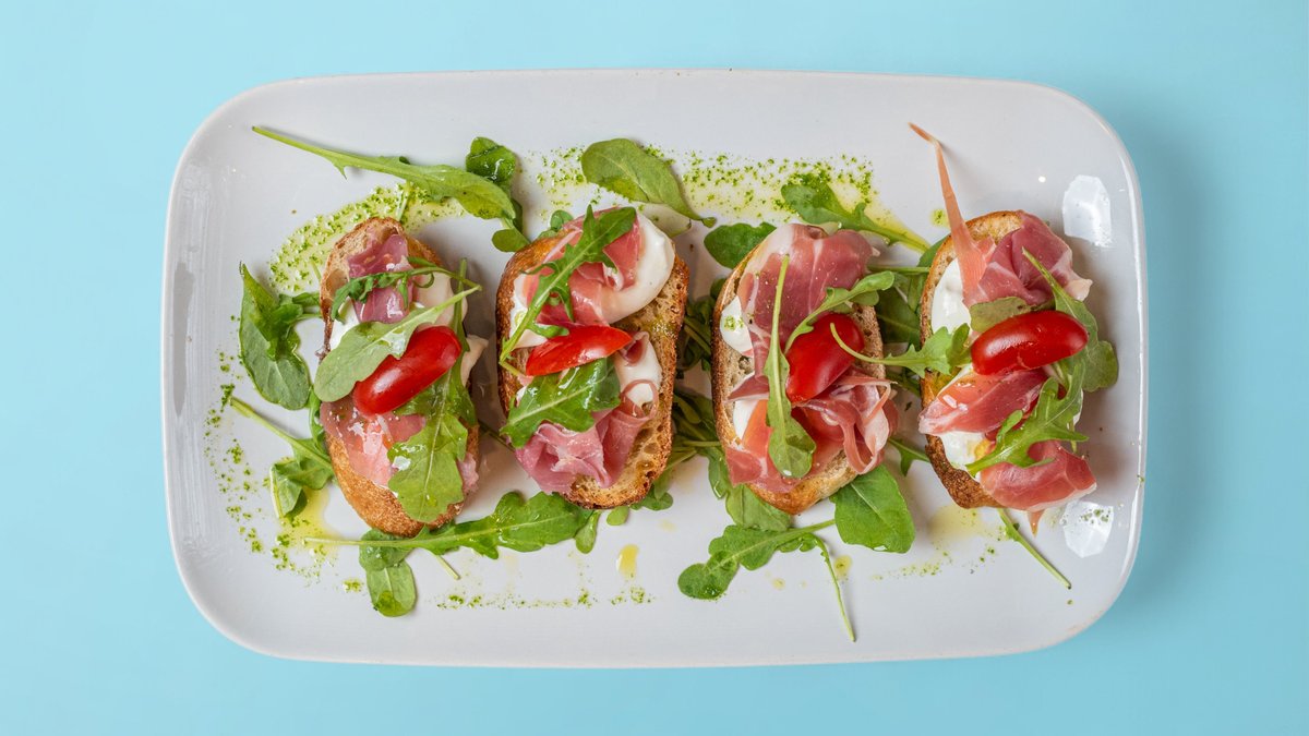 Прошуто крудо, рукола, бурата крем, EѴОО зехтин 4 бр
