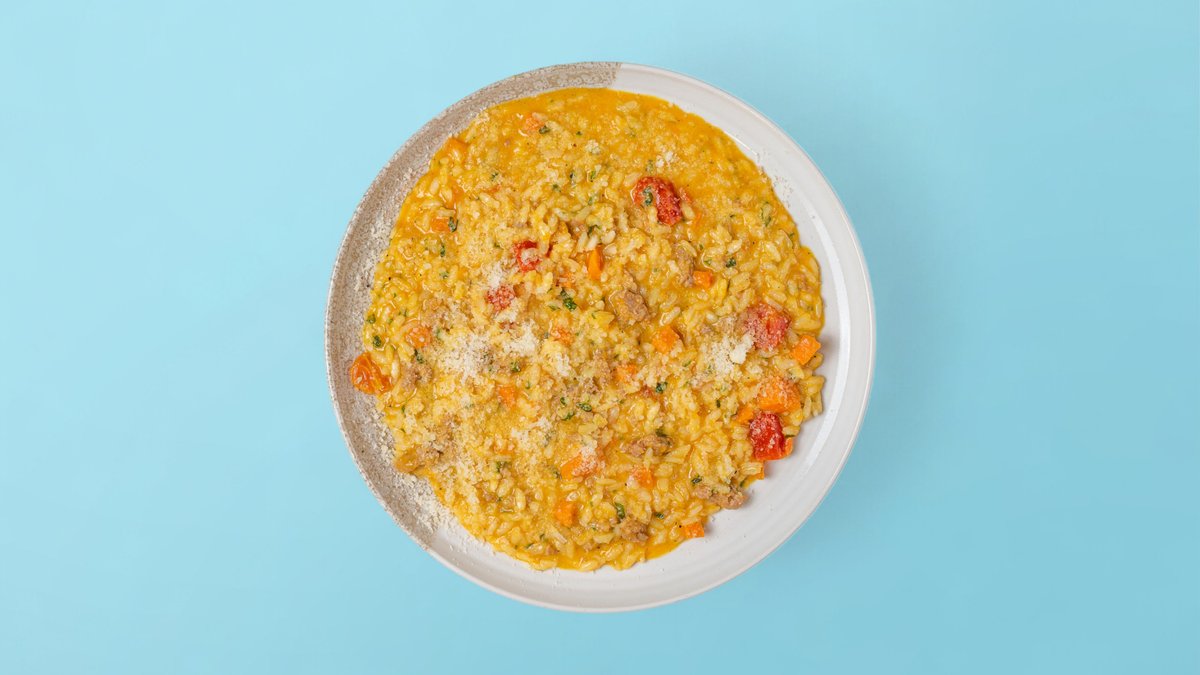 ориз Карнароли, тиква, салсича, домати чери, магданоз, черен пипер, Пармезан, масло 250г