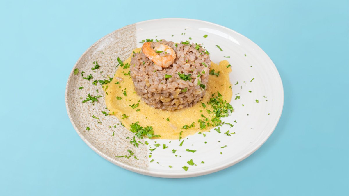 ориз Карнароли, крем от тиквички, скариди, чипс от тиквички, магданоз, Пармезан, масло 250г