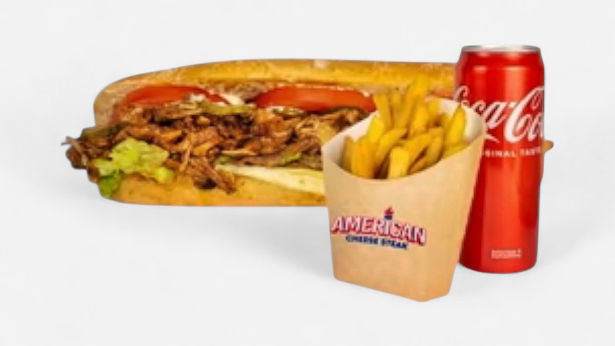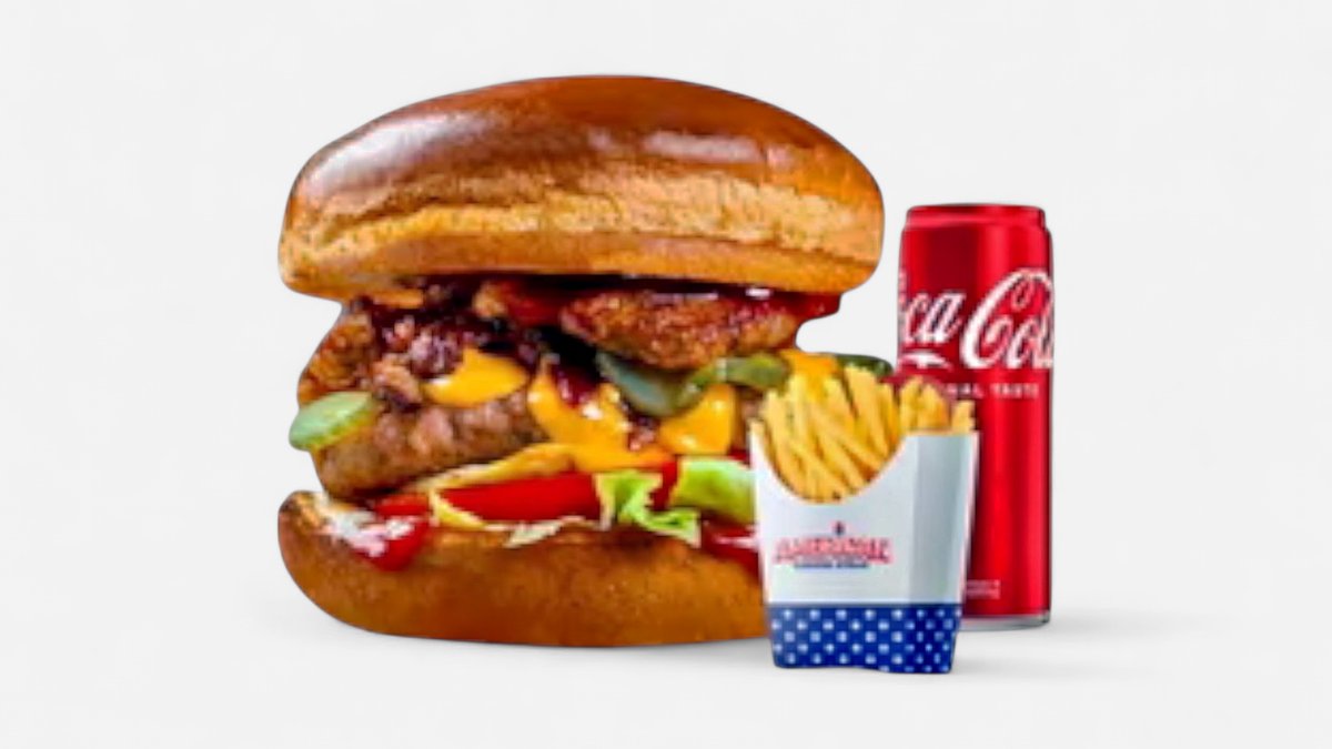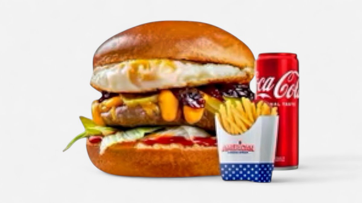 Американски бургер (350г) + Пържени картофки (135г) + Coca-Cola (330мл)