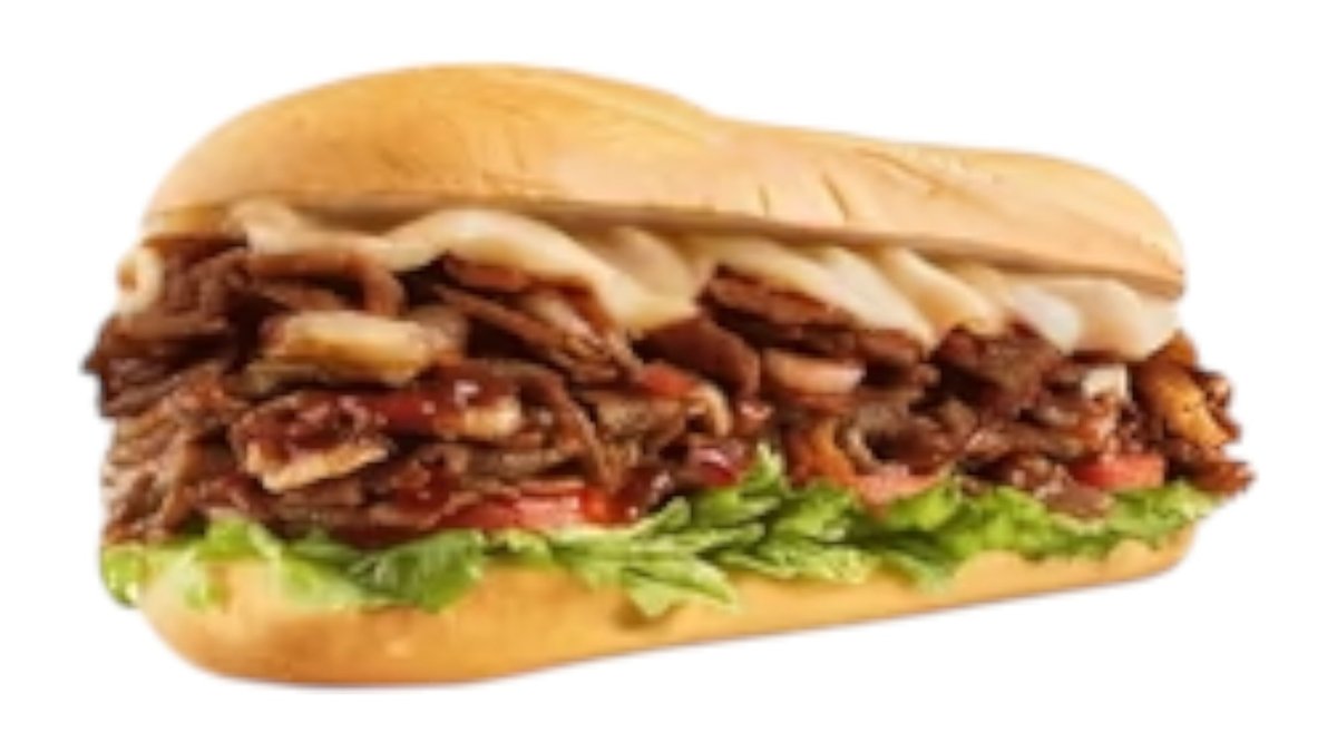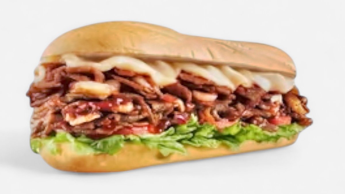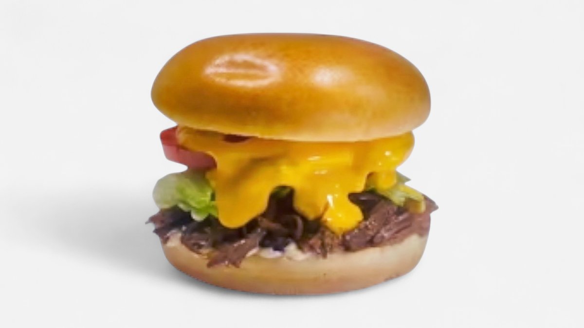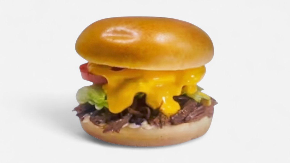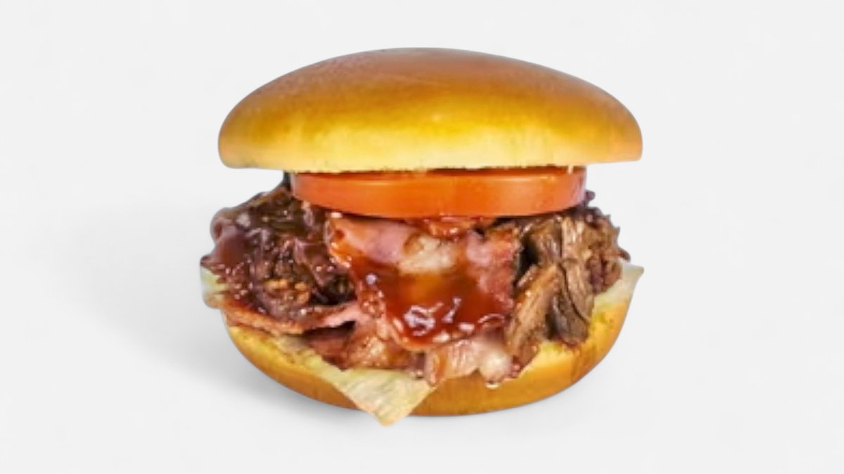 Бриош питка, телешко дърпано месо, айсберг, домат, кисела краставичка, карамелизиран лук, чедър, сос тартар, сос барбекю