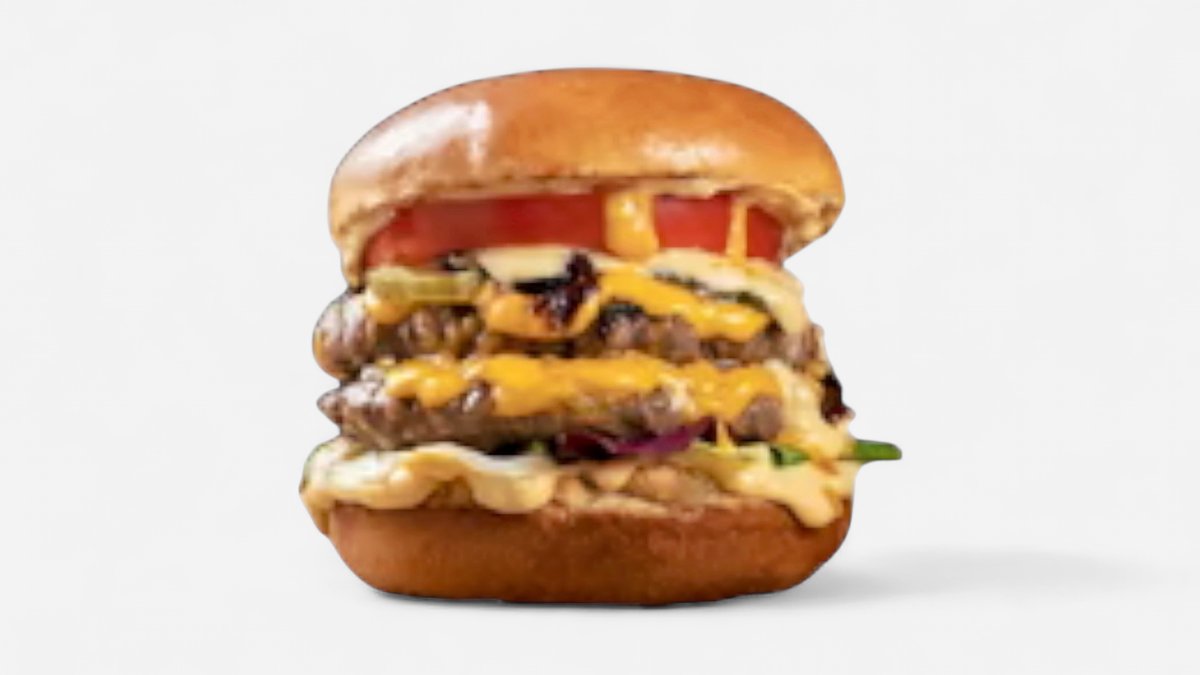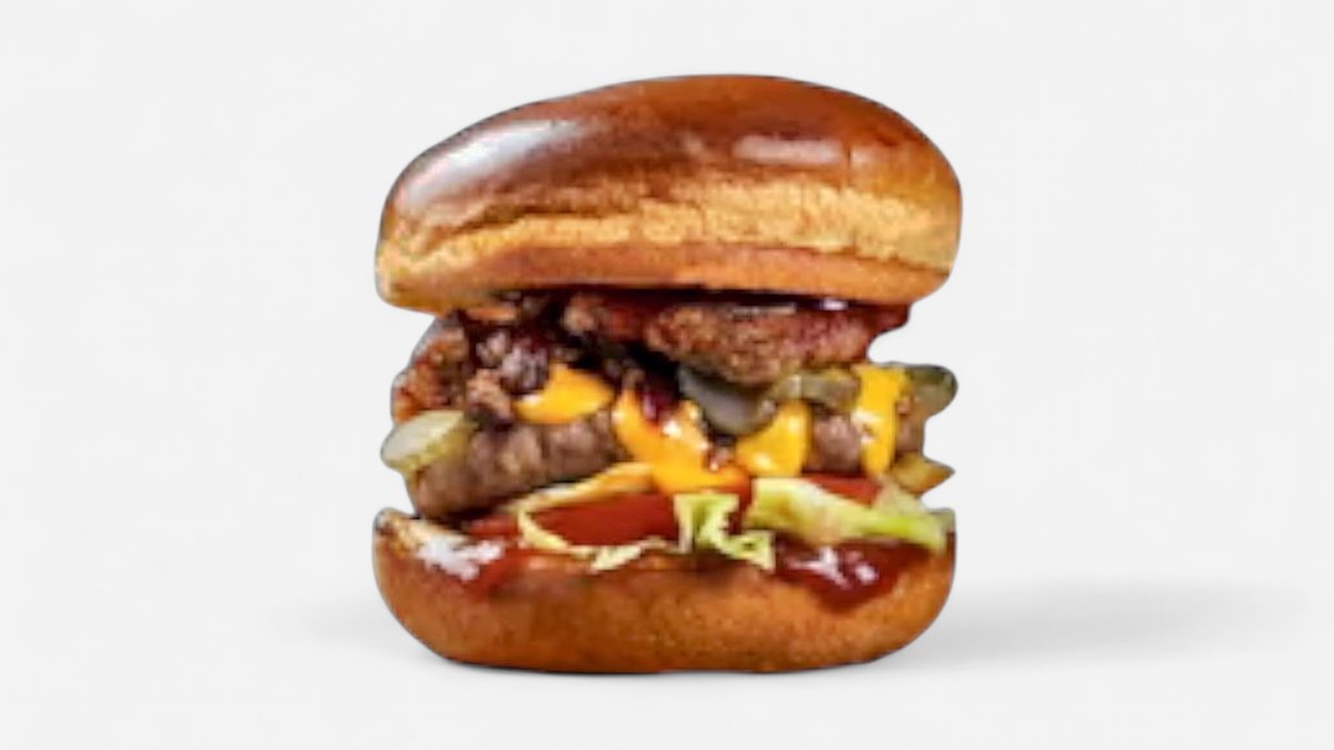 Домашен бриош комбиниран с 2х първокласни бургера от телешко месо, 2х разтопен английски чедър, карамелизиран лук, букет от листна салата, слайс домат, кисели краставички и бургер сос