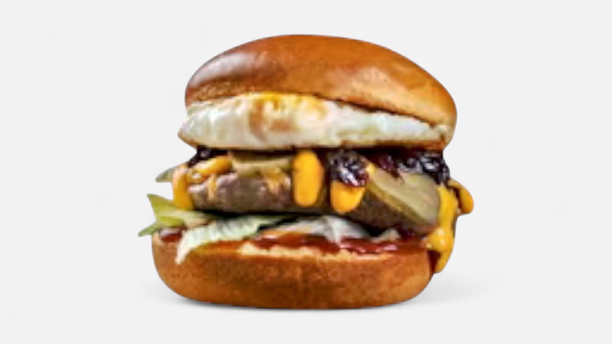 Дамашен бриош, първокласен бургер от телешко месо с разтопен английски чедър, яйце приготвено на плоча, американ сос, букет от листна салата, слайс от домат, карамелизиран лук, BBQ сос и кисели краставички