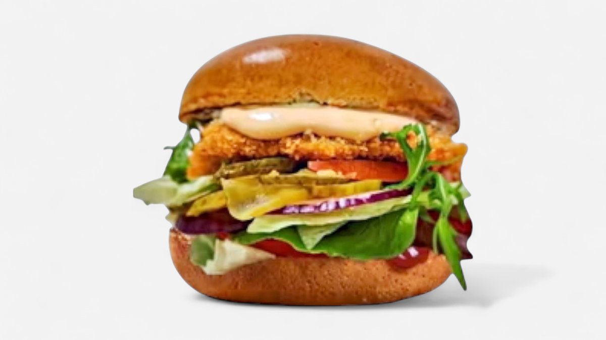 Бриош питка, пилешко филе, зелена салата микс, червен лук, кисела краставица, домат, сос тартар, домашен бургер сос