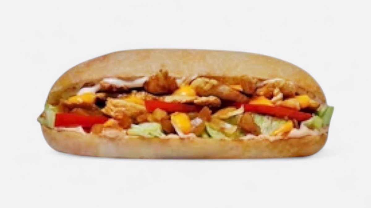 Питка, пилешко месо, домат, кис. краставички, сотиран лук, айсберг, разтопен чедър, барбекю сос, americano sauce