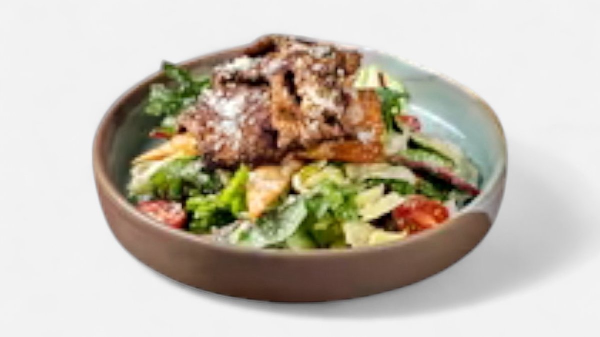 Микс от свежи листни салати с класически Цезар дресинг, чери доматчета, крутони от хрупкава тортила, мариновано месо от телешки стек и пармезан