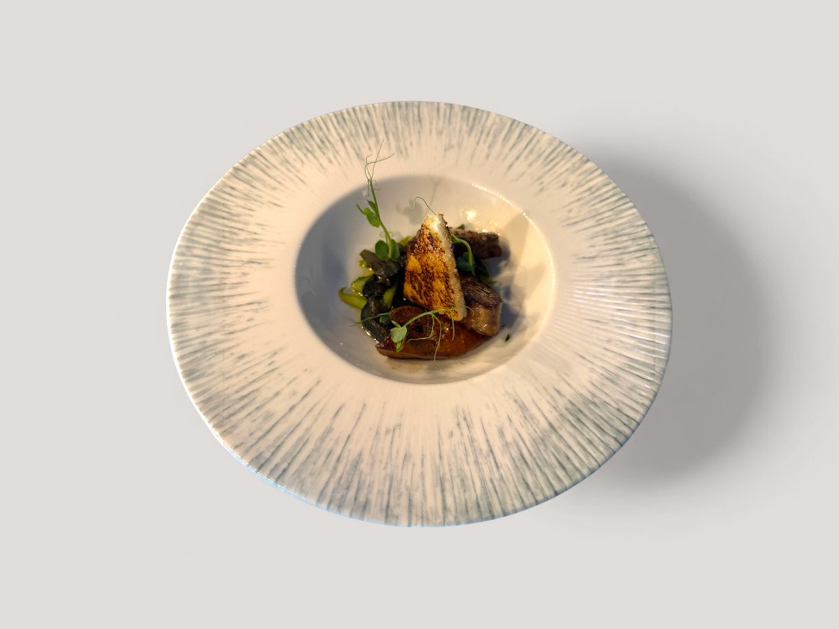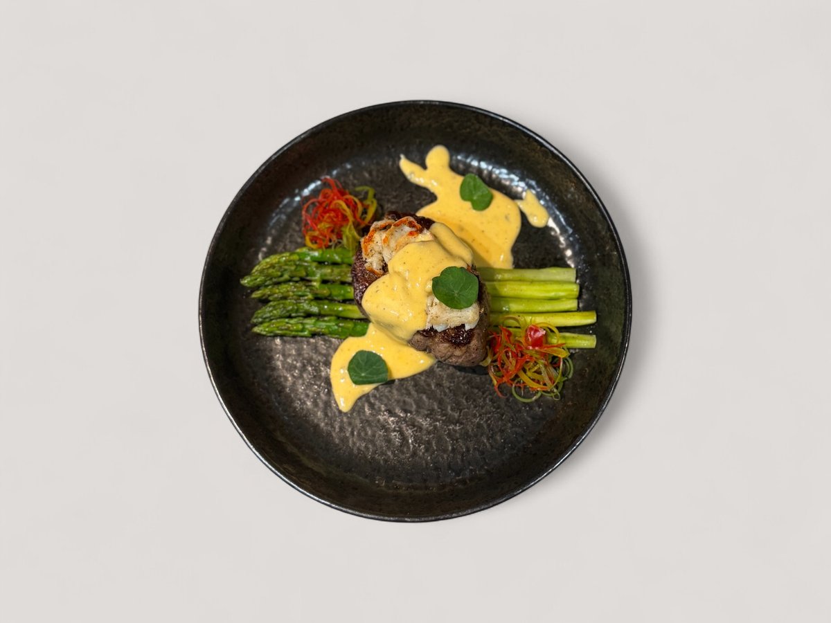 телешко Black Angus, месо от лобстер, сотирани аспержи и сос беарнез 350г