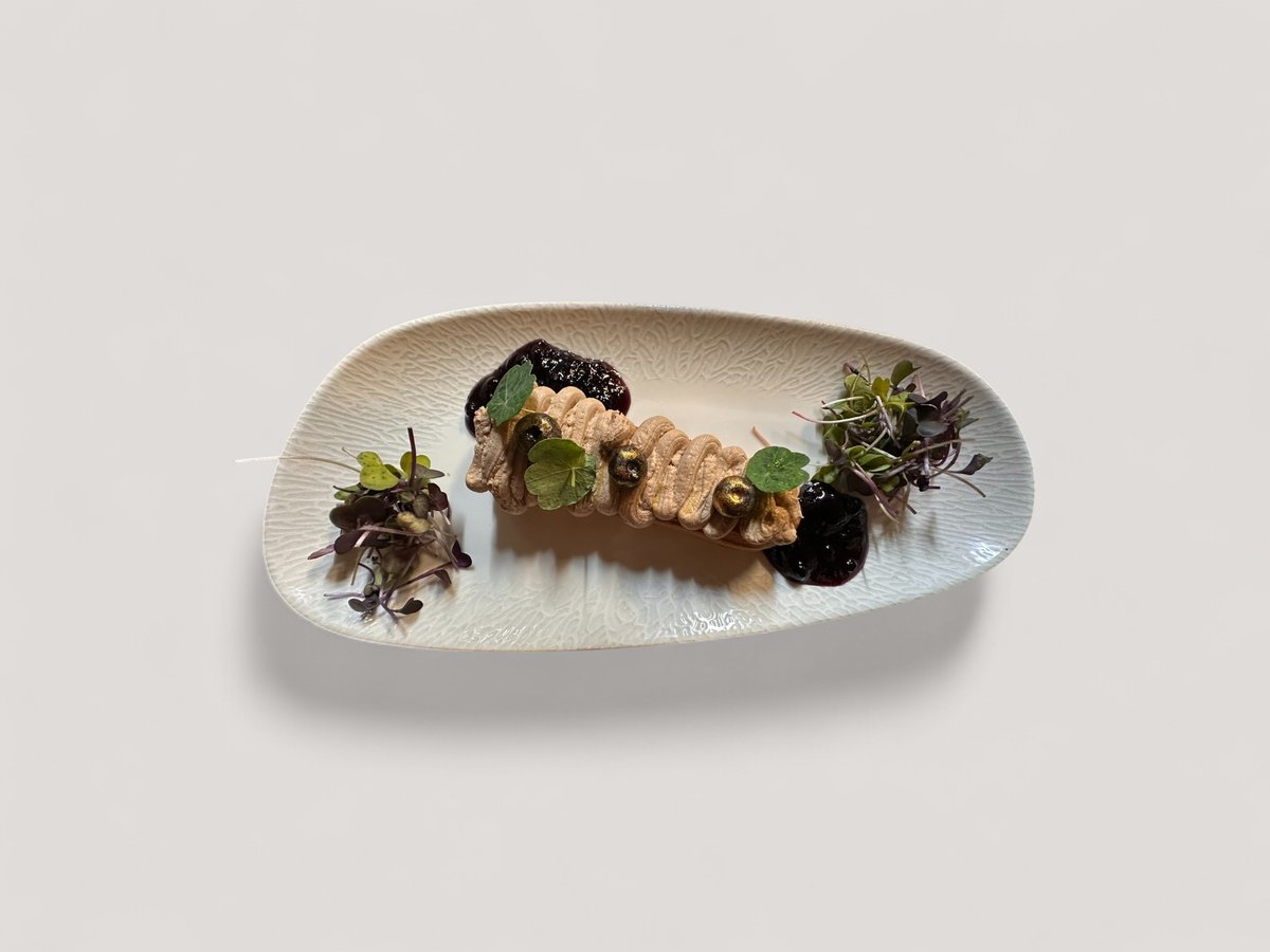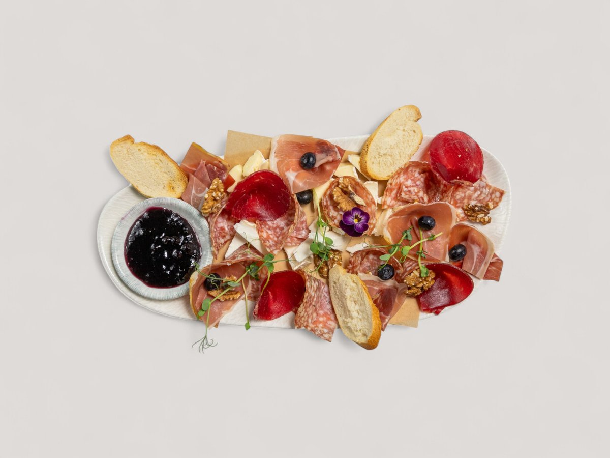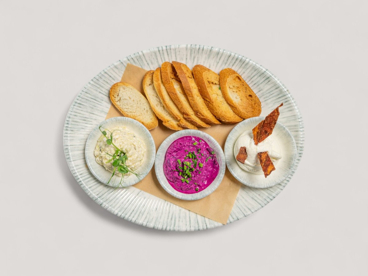 мус сирене с праз, разядка с пресен трюфел, разядка с печено цвекло и пушено козе сирене, чипс от бекон, брускети и пресен лук 200г