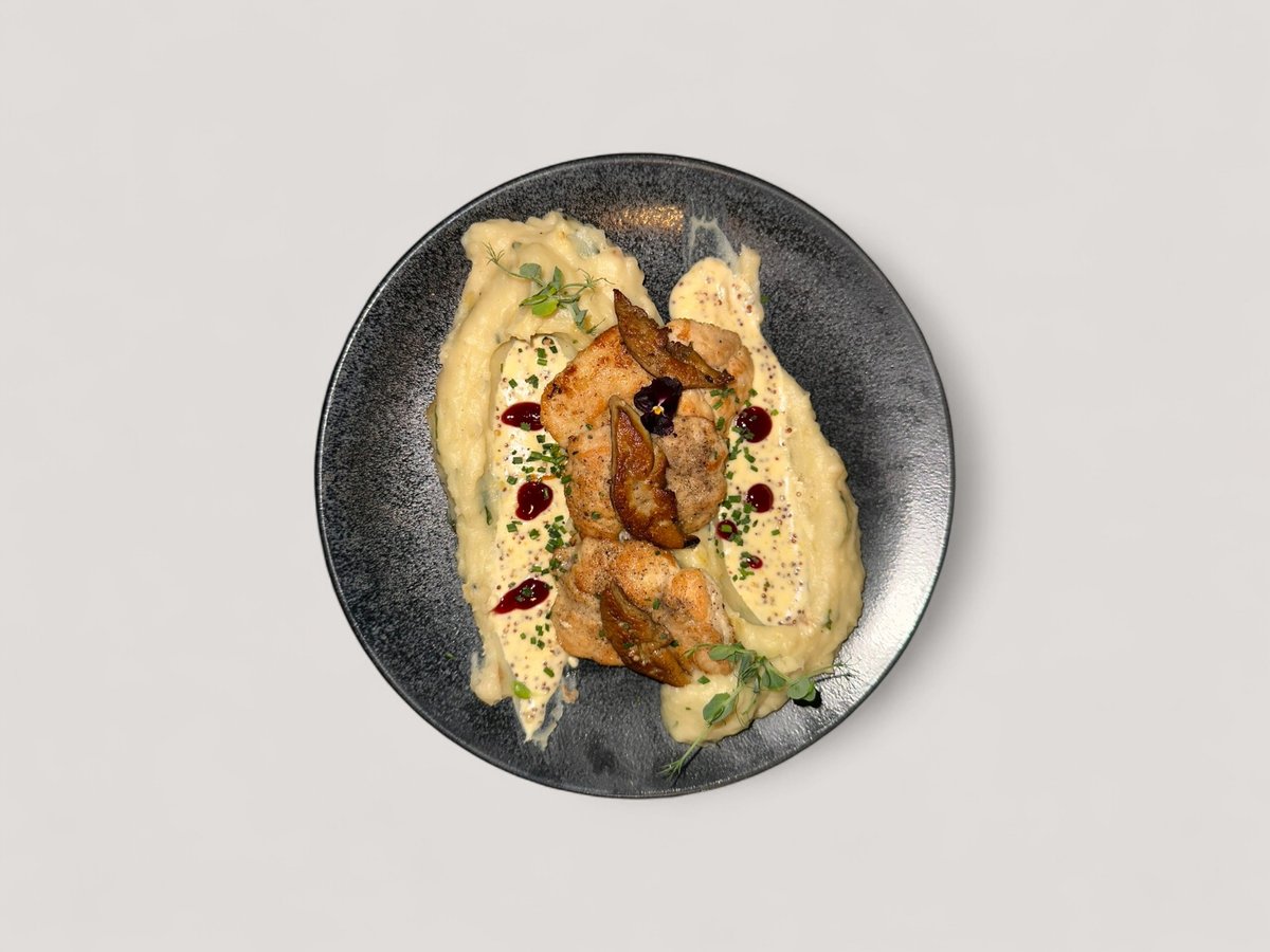картофено пюре с манатарки, босилек, сметанено-горчичен сос, малиново кули 320г