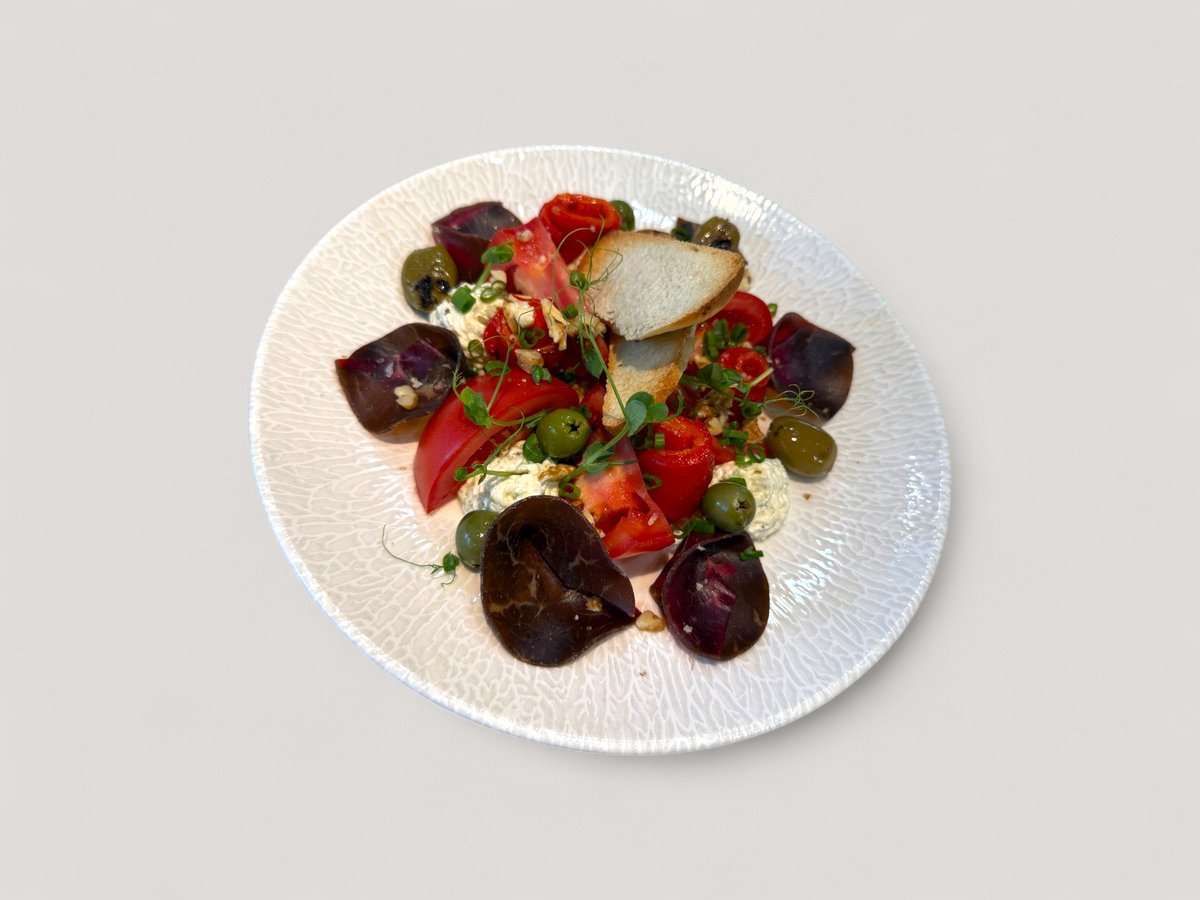 домати, печена чушка, мус сирене с праз, брускети, фризе, орехи, микс маслини, пресен лук 330г