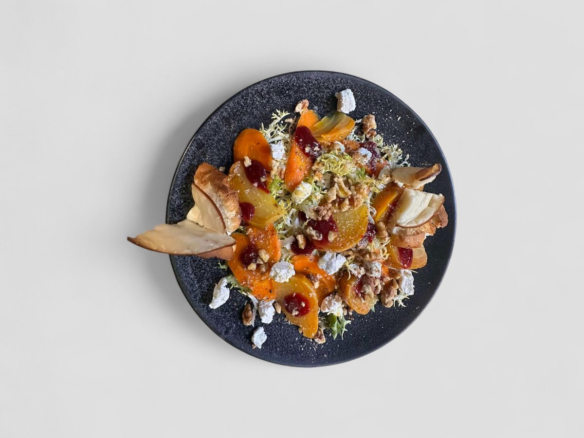 златно цвекло, мариновани моркови, фризе, запечен бриош с пушено козе сирене, малинов оцет, малиново кули, козе сирене шавру 300г