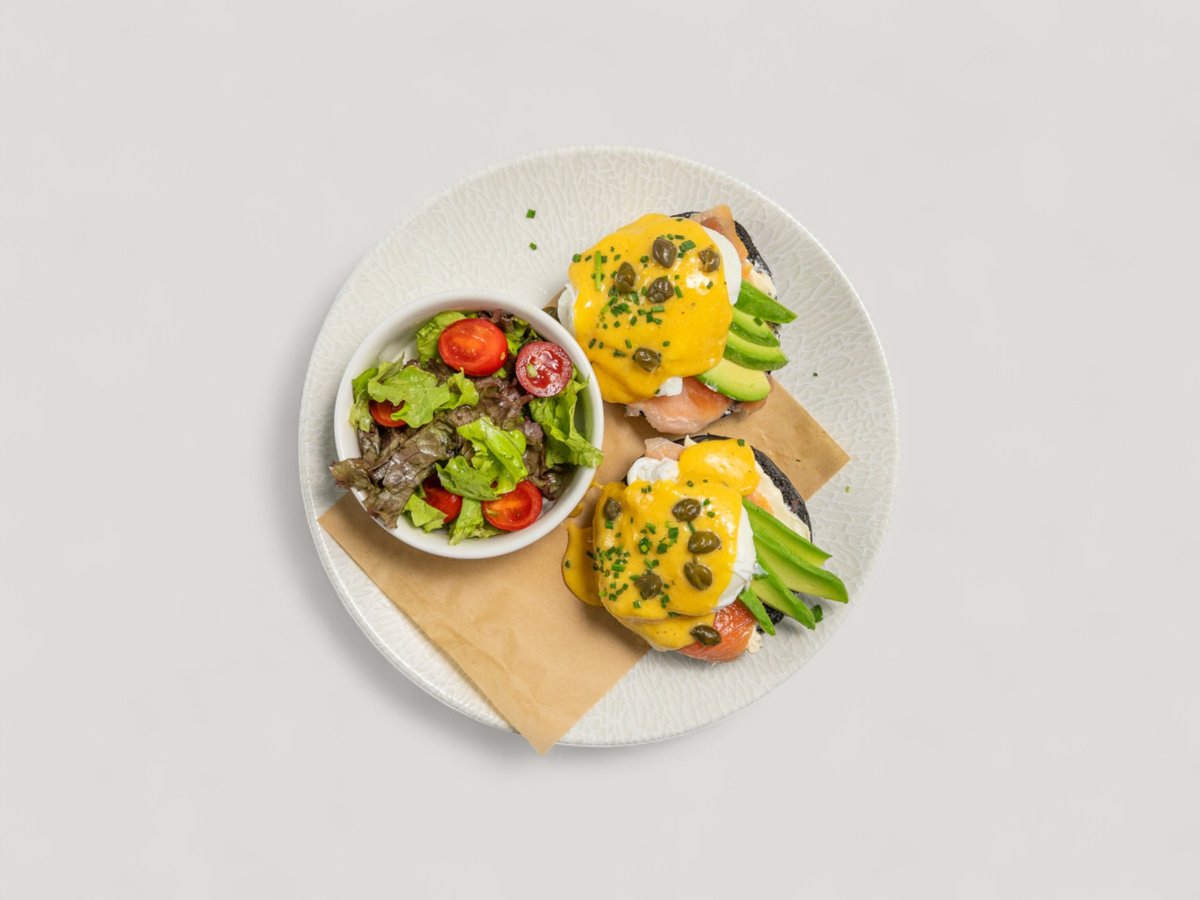 бриош с активен въглен, пушена сьомга, крема сирене, авокадо, сос холандез, каперси, див лук и свежа салата 300г