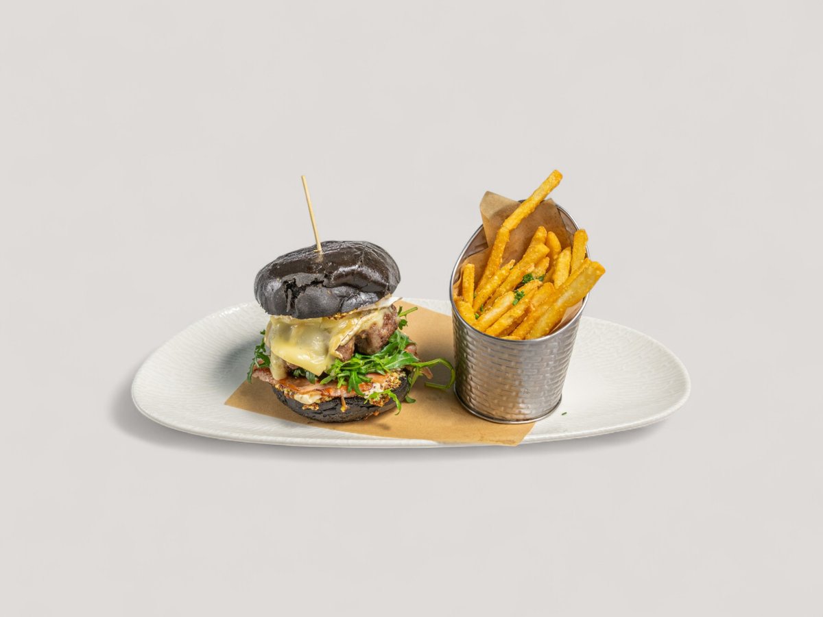 бриош с активен въглен, грилован домат, френски медено-горчичен сос, бекон, карамелизиран лук, бри, пържени картофи 420г