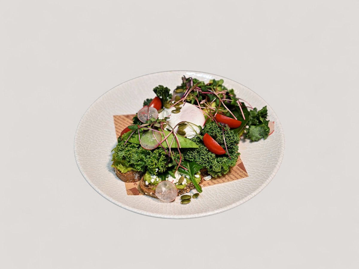 авокадо мус, кейл, бейби спанак, поширано яйце, чери, кълнове и тиквени семки 300г