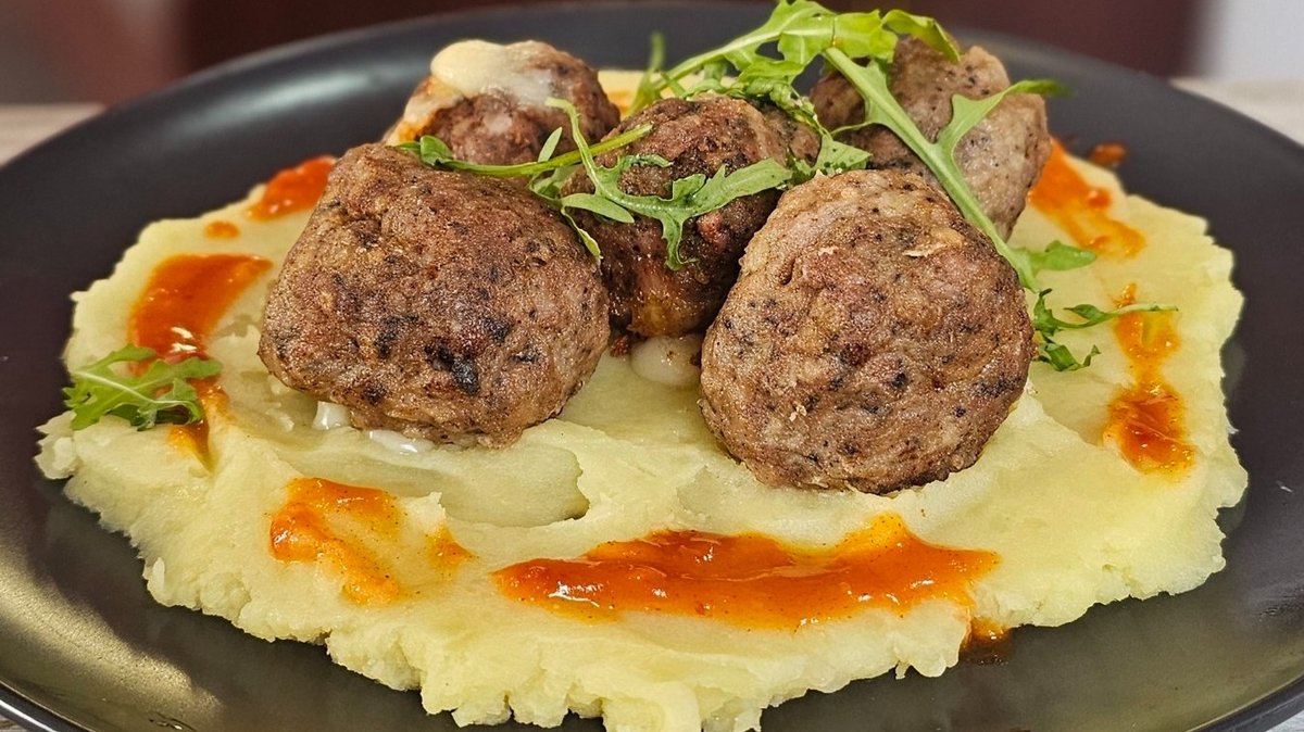 Свинско и телешко мляно месо, подправки, картофено пюре, сос по избор