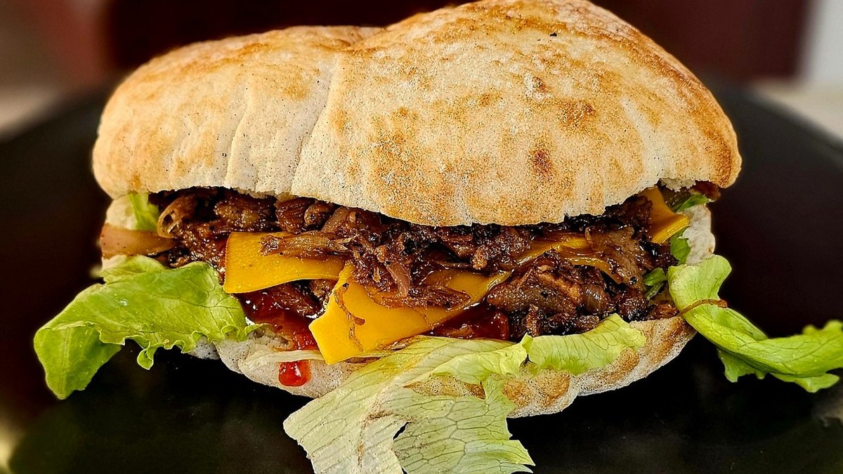 Питка Бриош, мляно месо, айсберг, домати, чедър, моцарела, специален сос ГаГа