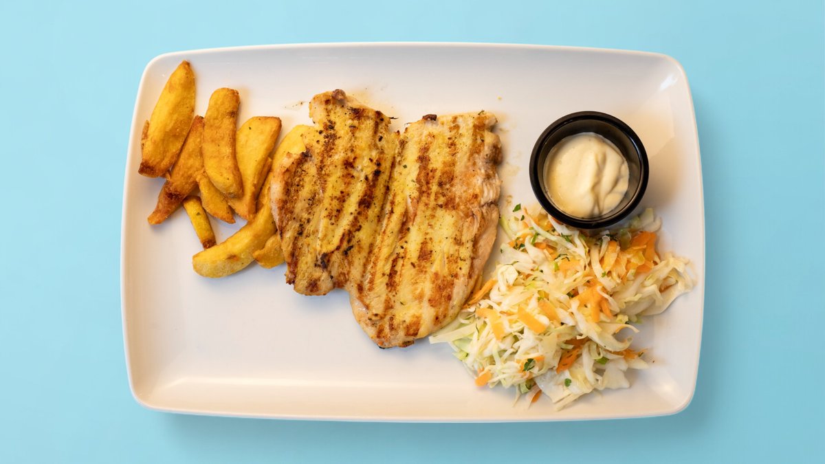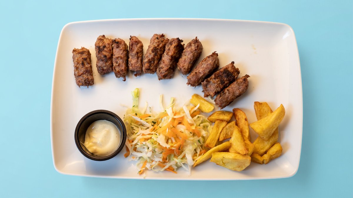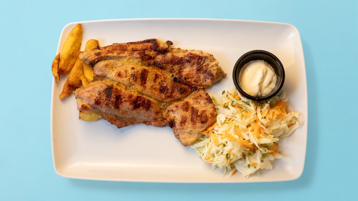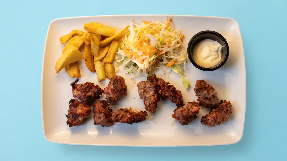 Гарнитурата към скарата е домашни пържени картофи, салата зеле и моркови и домашна сръбска майонеза. В цената на всяко ястие е включена кутия.