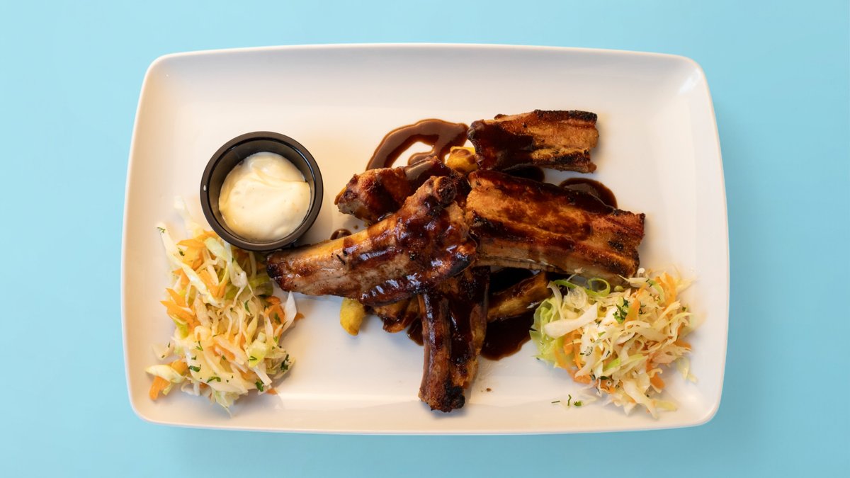 Телешка плескавица, чедър, айсберг, карамелизиран лук, кис. краставици, пържени картофи, bbq сос 350rp