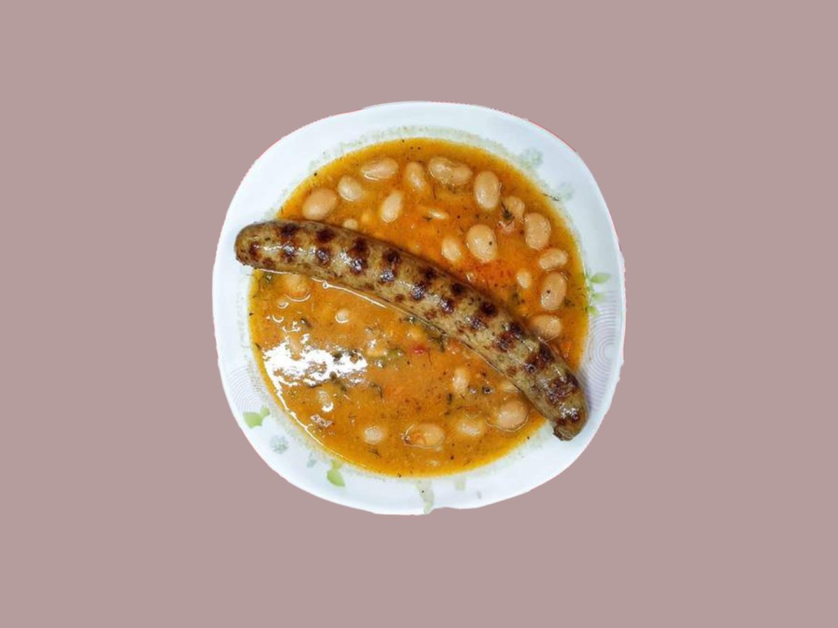Боб яхния със две кебапчета от скарата