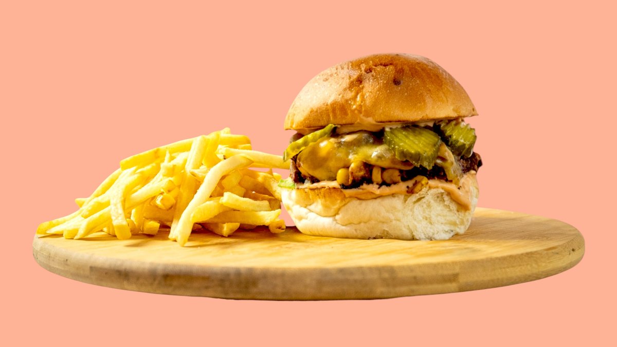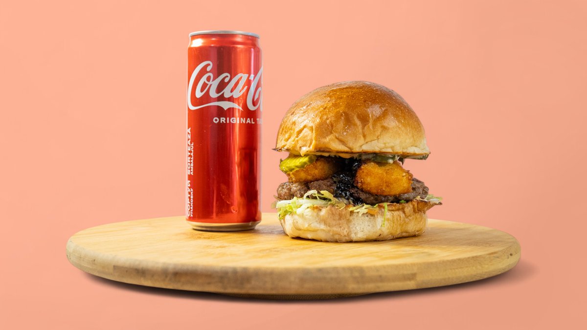 400г - прясно изпечена Бриош питка, 100% телешко месо овкусено само със сол, хрупкав бекон, айсберг, домашно мариновани кисели краставички, панирани триъгълни топени сиренца, сладко от горски боровинки и Brunch сос
