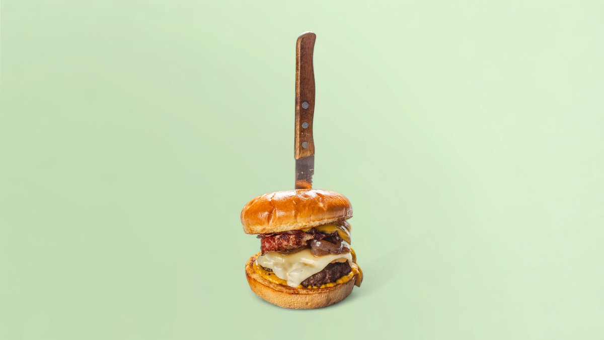 телешки двойно смлян бургер, пушена гауда, пушено сирене, карамелизиран лук, пушена горчица, хрупков бекон 450г