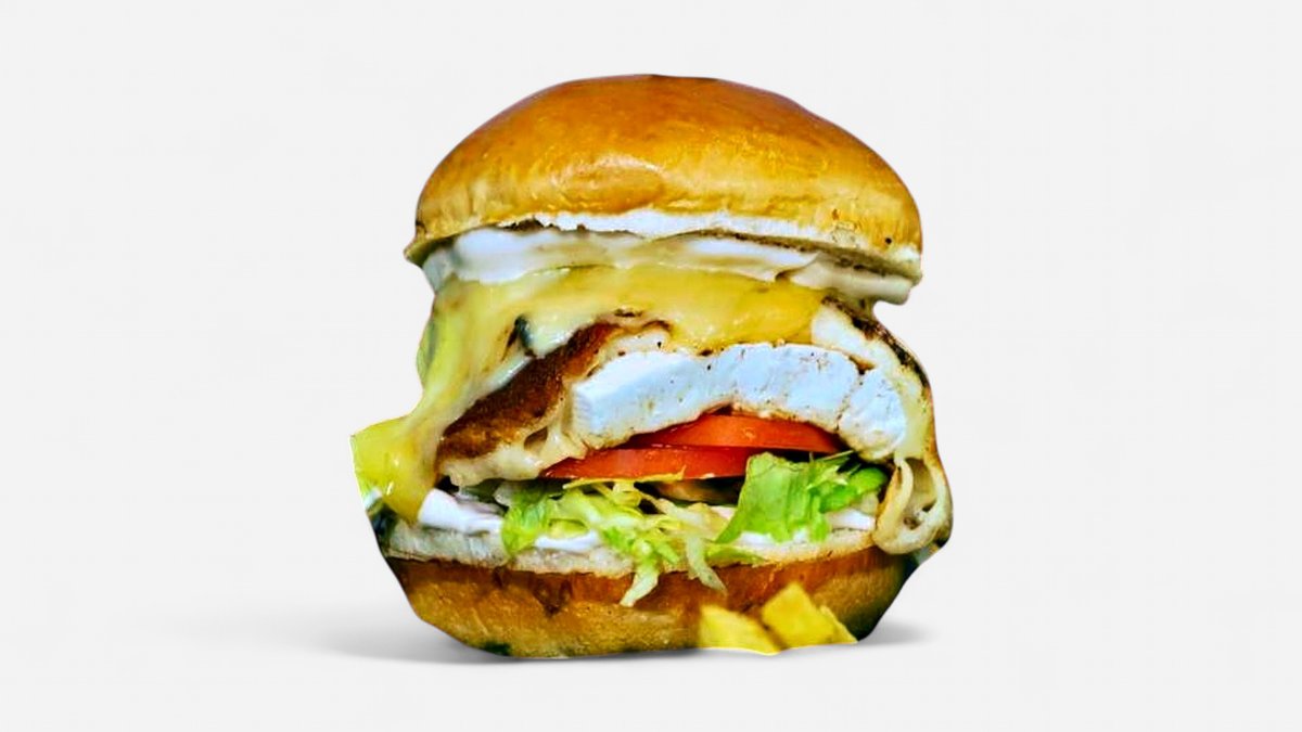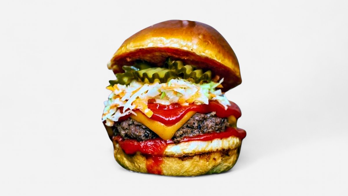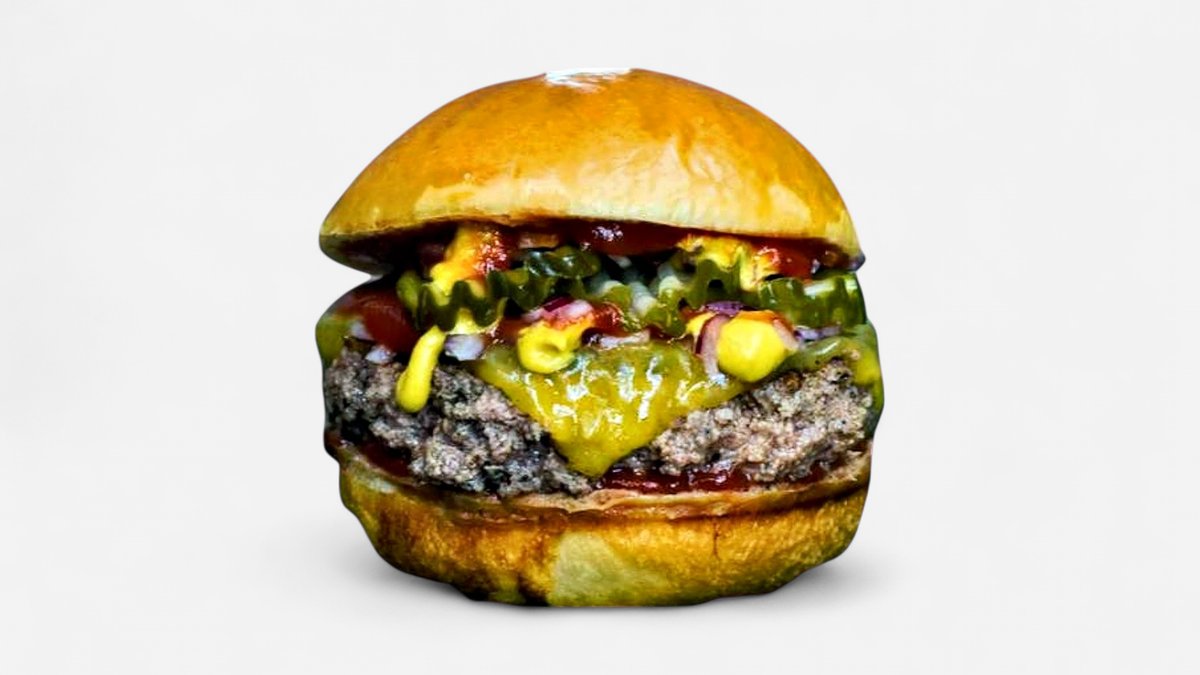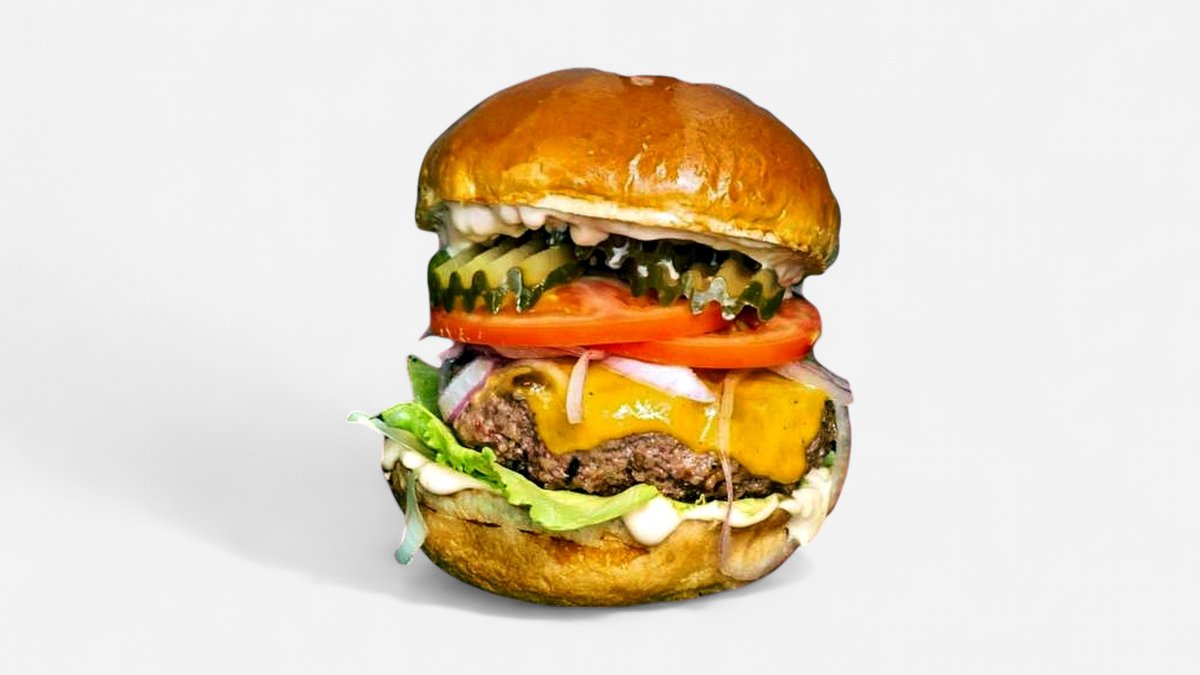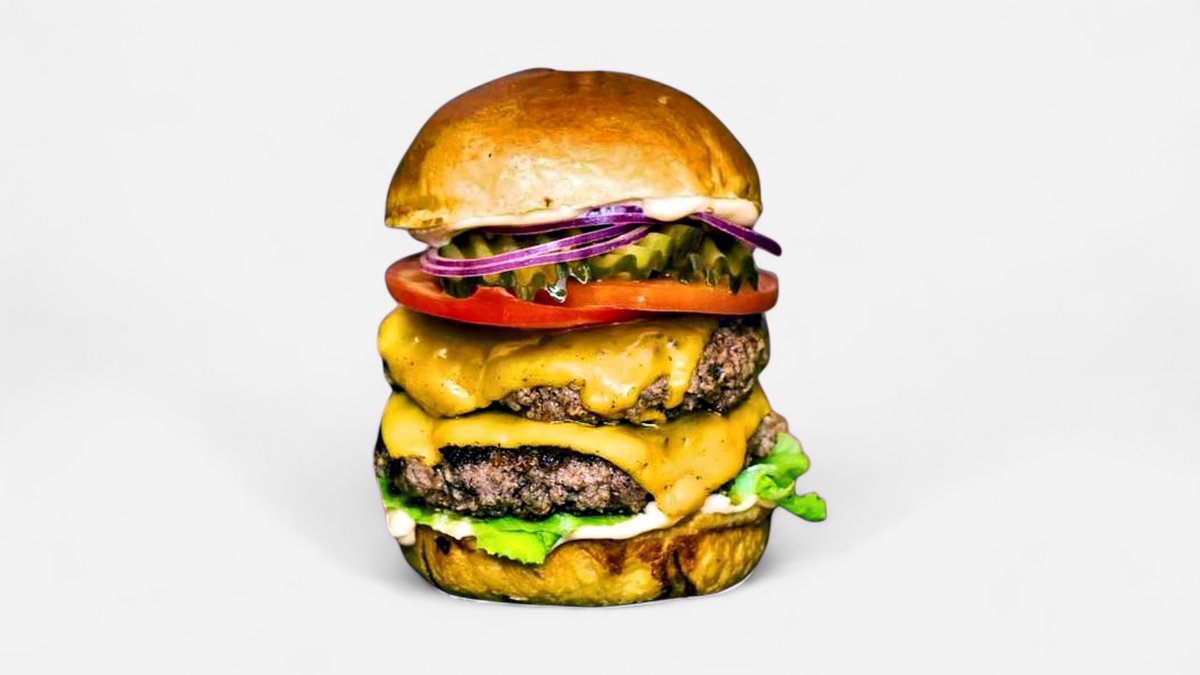 бриош хлебче, 2х сочен 100 % телешки бургер 150г, 2х английски Чедър сирене, кисели краставички, айсберг, домат, лук, хаус сос 500г
