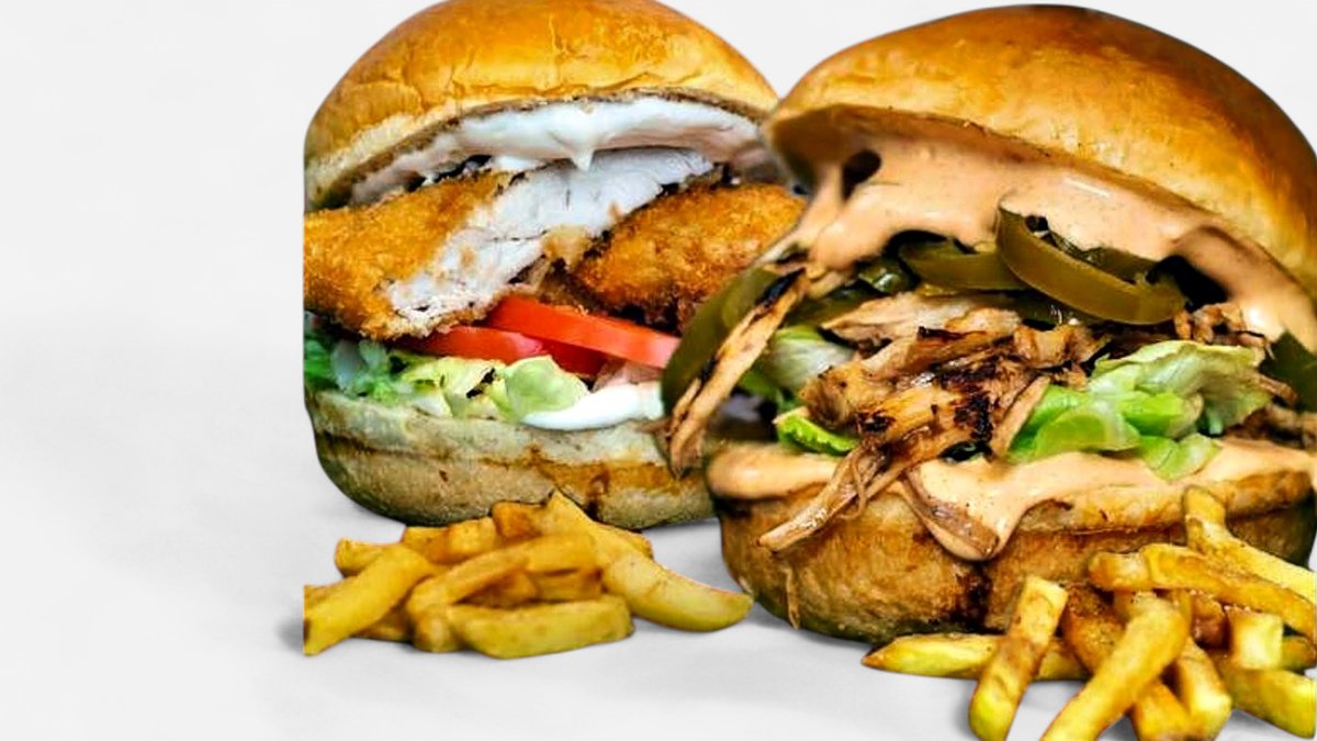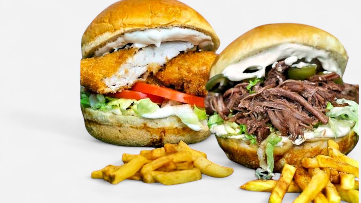 два бургера, посочените, два пъти картофки или лучени кръгчета и две безалкохолни по избoр