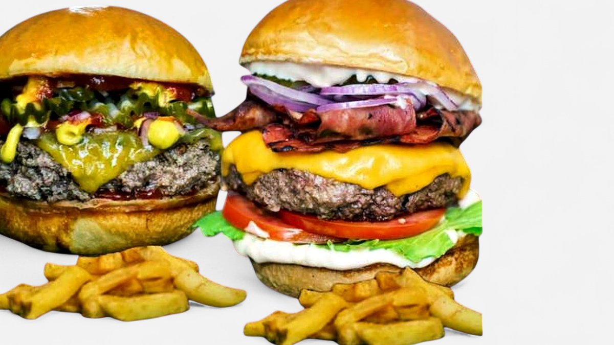 два бургера, посочените, два пъти картофки или лучени кръгчета и две безалкохолни по избор