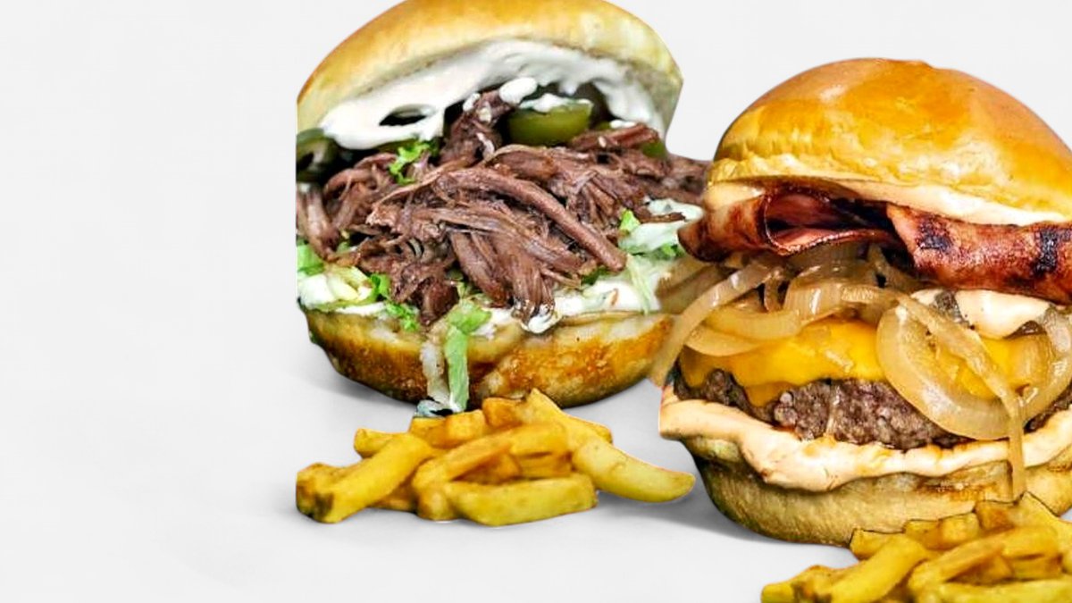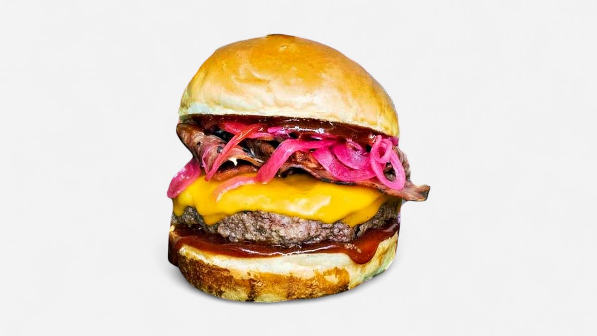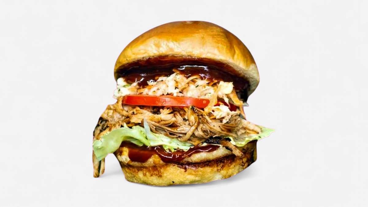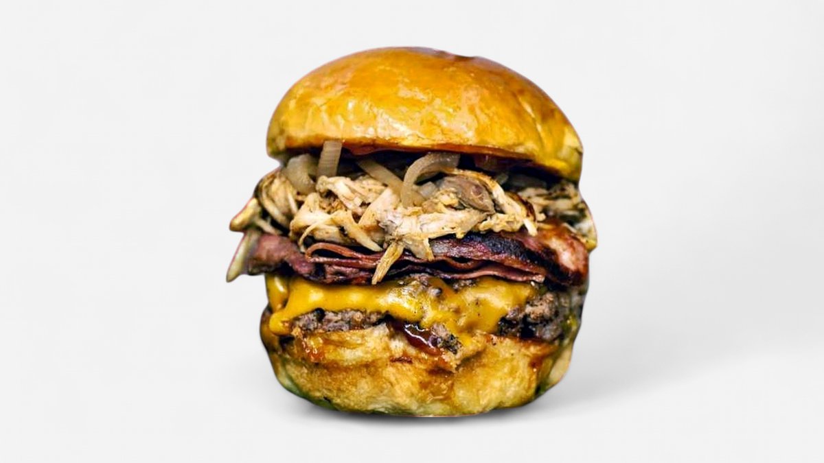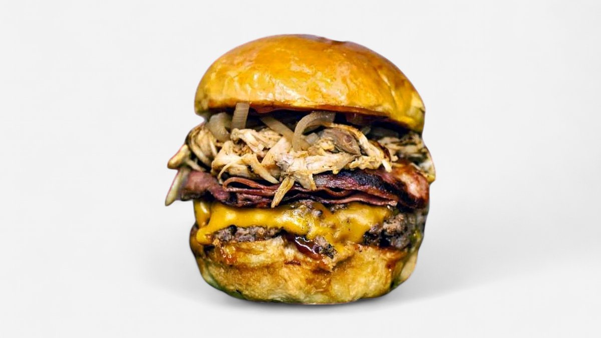 брйош хлебче 150г, бавно готвено дърпано свинско месо 150г, сочен 100% телешки бургер, бекон слайс, английски Чедър сирене, карамелизиран лук, барбекю сос 500г
