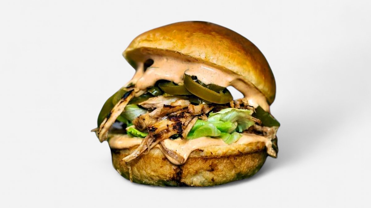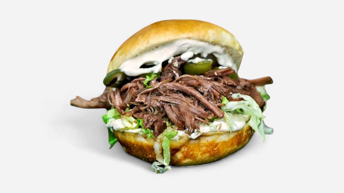 брйош хлебче, бавно печено дърпано телешко месо, халапеньос, айоли сос (айоли сосът е по специялна наша рецепта), много лека майонеза с аромат на печен чесън, страхотна 350г