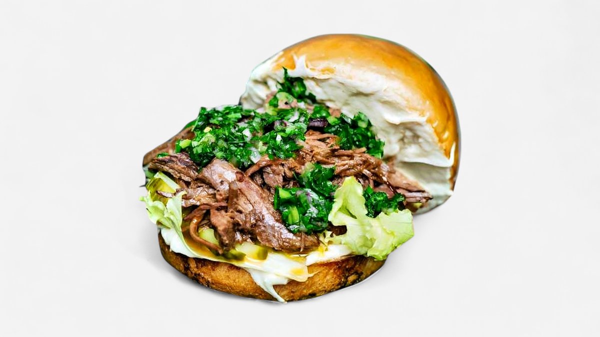 брйош хлебче, бавно печено дърпано телешко месо (по специялна рецепта телешко месо, късано), чимичури, кисели краставички, айсберг, айоли сос (е по специялна наша рецепта, много лека майонеза с аромат на печен чесън) 430г