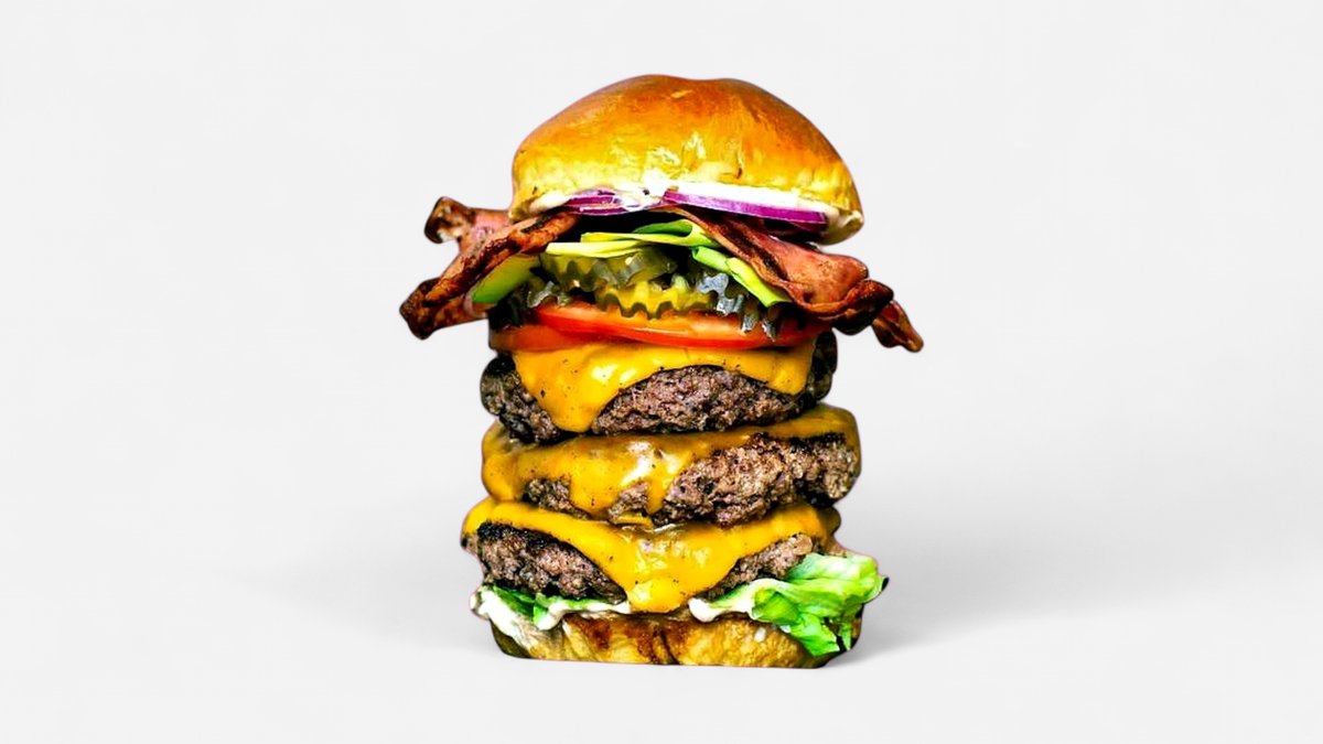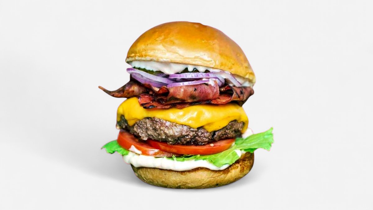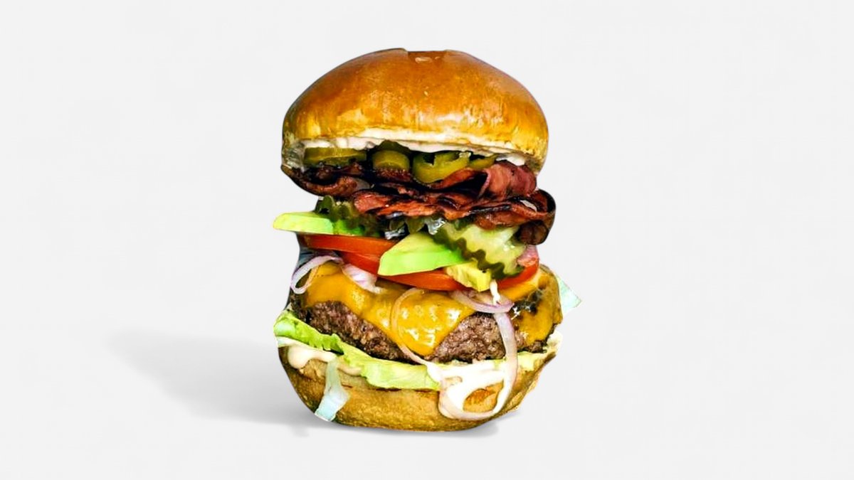 бриош хлебче, 3х сочен 100 % телешки бургер 150г, 3х бекон слайс, 3х английски Чедър сирене, авокадо, кисели краставички, айсберг, домат, лук, хаус сос 690г